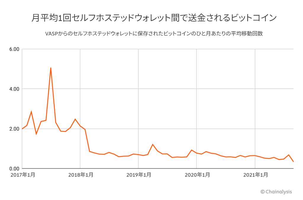 取引所からの資金がアンホステッドウォレットに入金された後、特定の月にビットコインが別のアンホステッドウォレットへ移される割合は極めて低くなっています。ビットコインのほとんどは、長期間にわたり元のウォレットに保存されたままになっています。VASPからアンホステッドウォレットへ移された資金は、平均月に1度しか移動しておらず、これはその主な用途が投資目的であることを示していると考えられます。