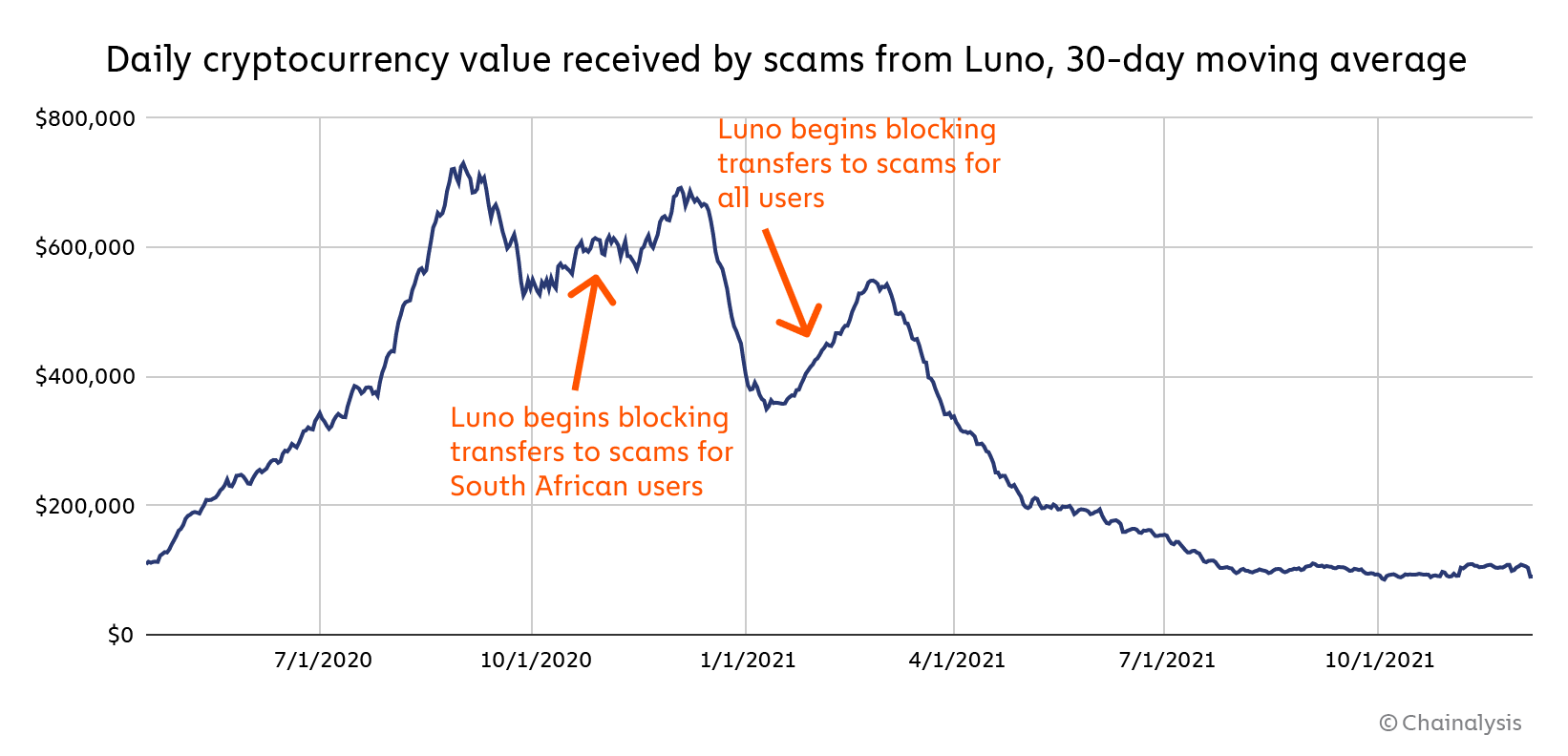 Scams represent a huge barrier to successful cryptocurrency adoption, and fighting them can’t be left only to law enforcement and regulators. Cryptocurrency businesses, financial institutions, and, of course, Chainalysis have an important role to play as well. With this strategy, Luno took a courageous step towards establishing greater trust and safety in cryptocurrency, which we hope to continue to see grow in the industry.