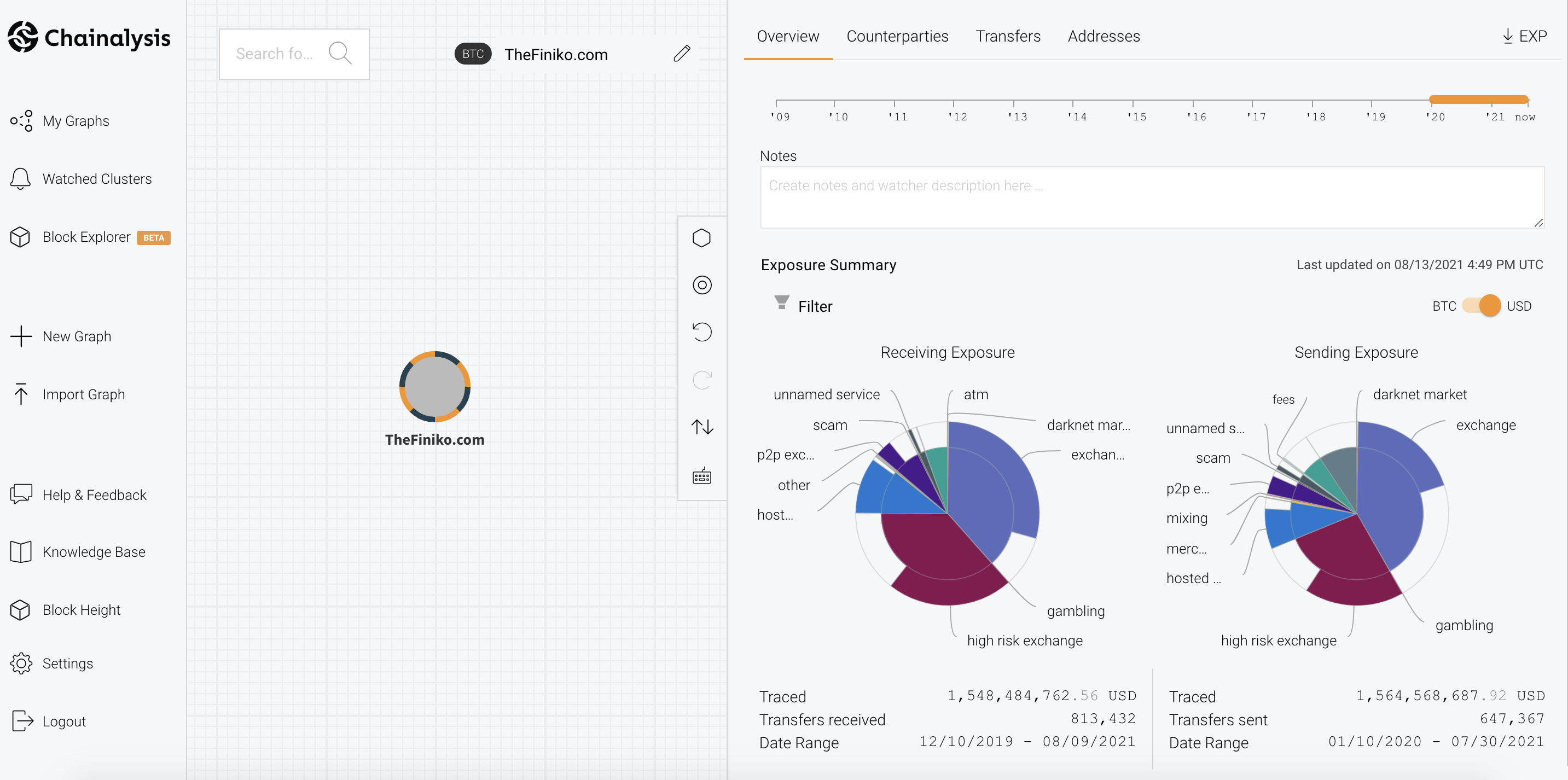 According to the Moscow Times, Finiko was headed up by Kirill Doronin, a popular Instagram influencer who has been associated with other Ponzi schemes. The article notes that Finiko was able to take advantage of difficult economic conditions in Russia exacerbated by the Covid pandemic, attracting users desperate to make extra money. Chainalysis Reactor shows us how prolific the scam was.