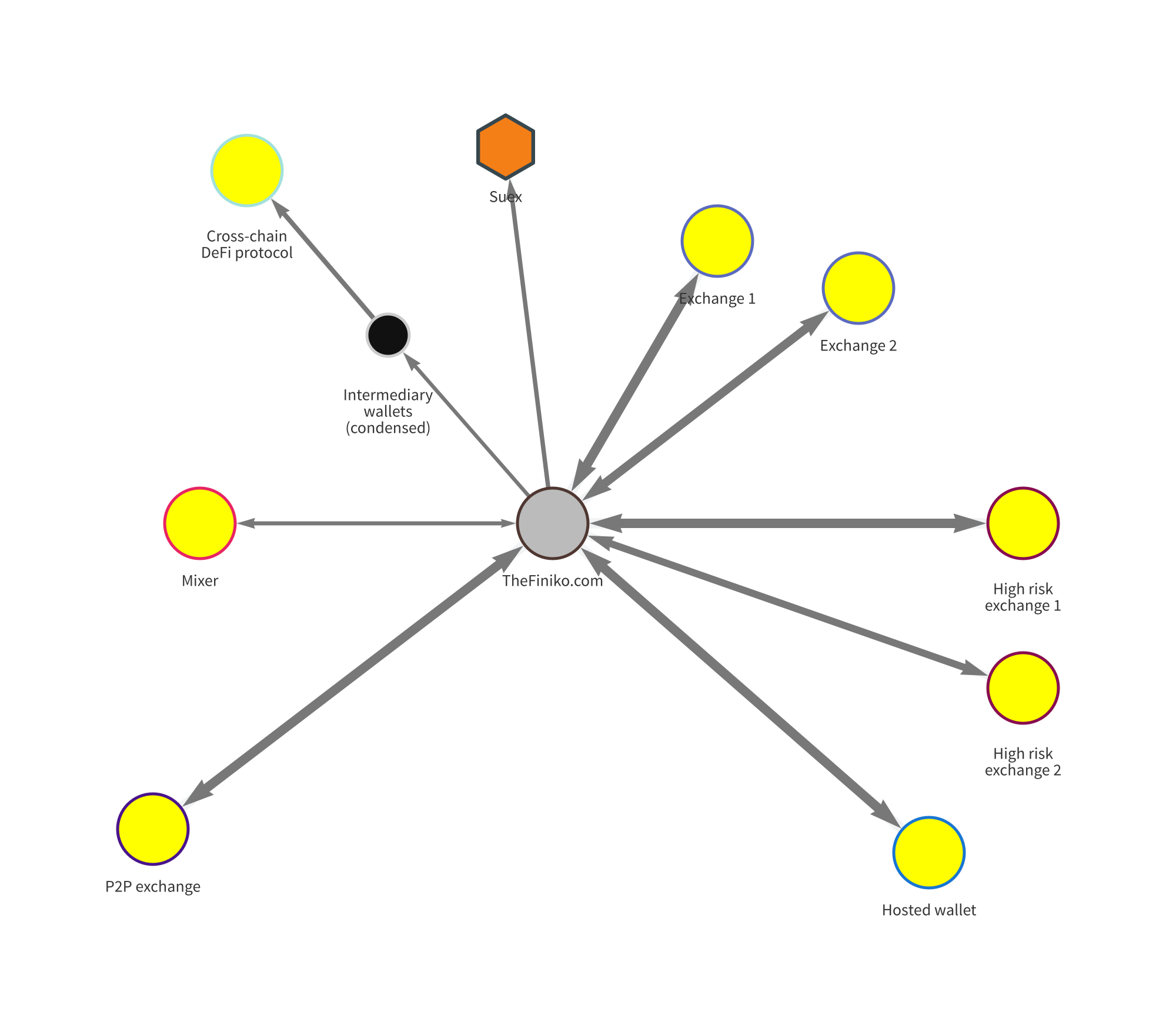Finiko sent most of its more than $1.5 billion worth of cryptocurrency to mainstream exchanges, high-risk exchanges, a hosted wallet service, and a P2P exchange. However, we don’t know what share of those transfers represent payments to victims in order to give the appearance of successful investments.