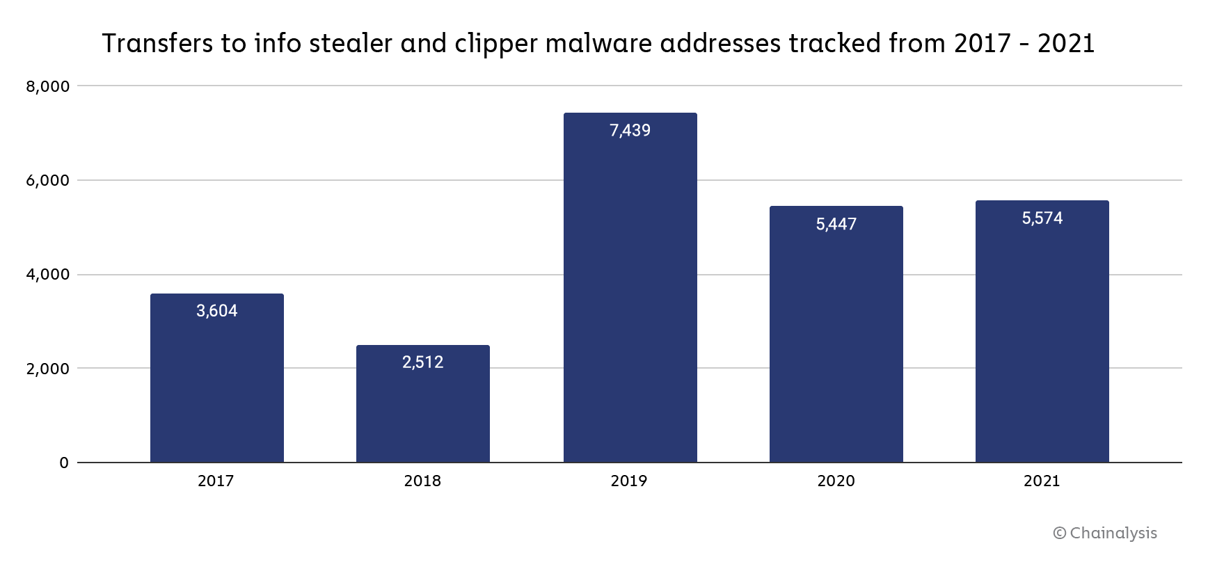 The graph below shows the number of victim transfers to cryptocurrency addresses associated with a sample of malware families in the info stealer and clipper categories investigated by Chainalysis.