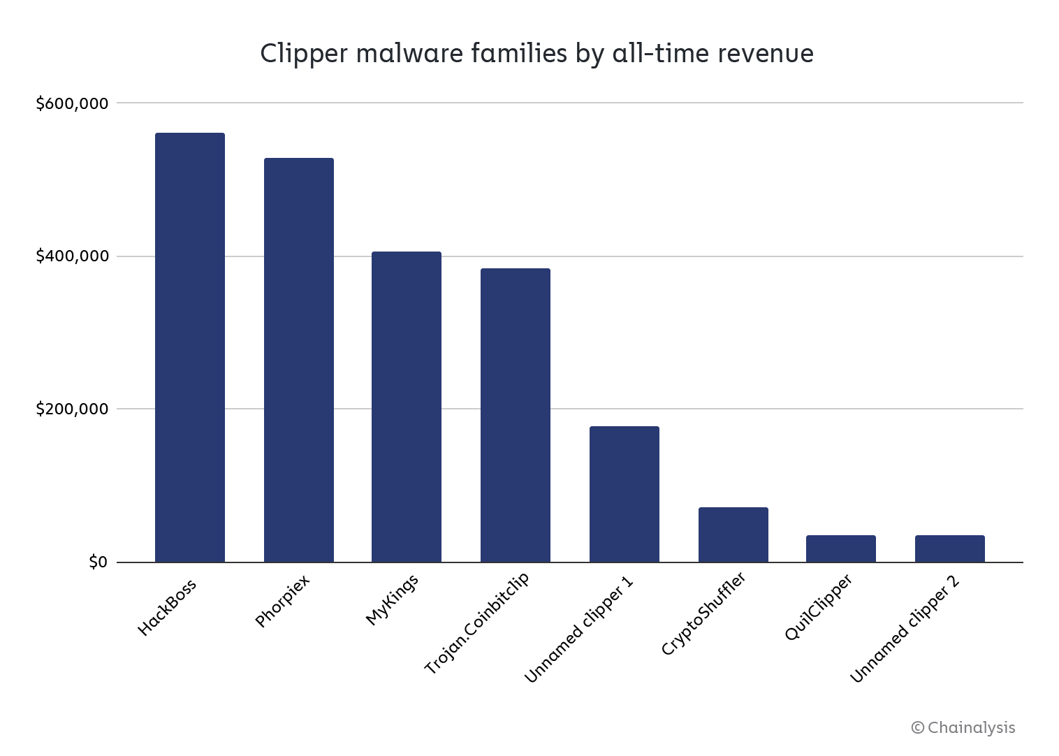 According to Chainalysis data, the HackBoss clipper stole over $80,000 worth of cryptocurrency throughout 2021. Since 2012, HackBoss has been the most prolific clipper malware overall, having taken over $560,000 from victims in assets like Bitcoin, Ethereum, Ripple, and more.
