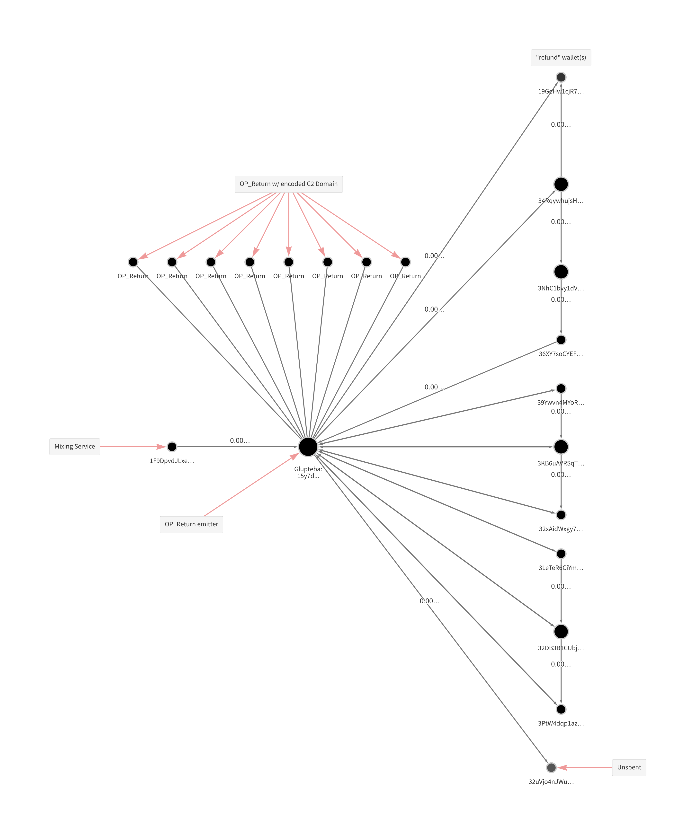 We see that the Glupteba address received its initial funding from a mixing service, before initiating the invalid transactions with Op_Returns we see at the top of the graph. The funds associated with those invalid transactions then travel to the refund wallets on the right, and eventually back to the original Glupteba address. The other two addresses show similar transaction patterns. Google identified the three Glupteba addresses and brought them to Chainalysis, at which point our investigators were able to decode the data contained in the Op_Returns’ message fields, allowing them to discover the new C2 server domain addresses being sent to the botnet.