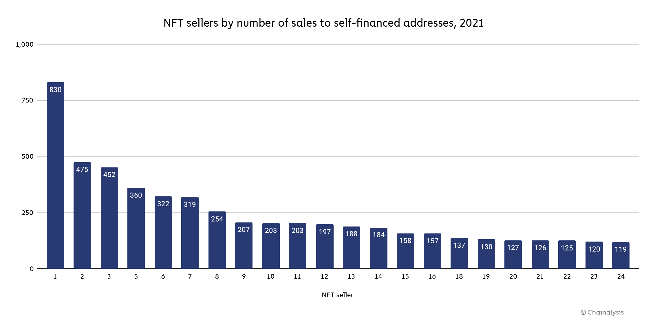 With blockchain analysis, however, we can track NFT wash trading by analyzing sales of NFTs to addresses that were self-financed, meaning they were funded either by the selling address or by the address that initially funded the selling address. Analysis of NFT sales to self-financed addresses shows that some NFT sellers have conducted hundreds of wash trades.