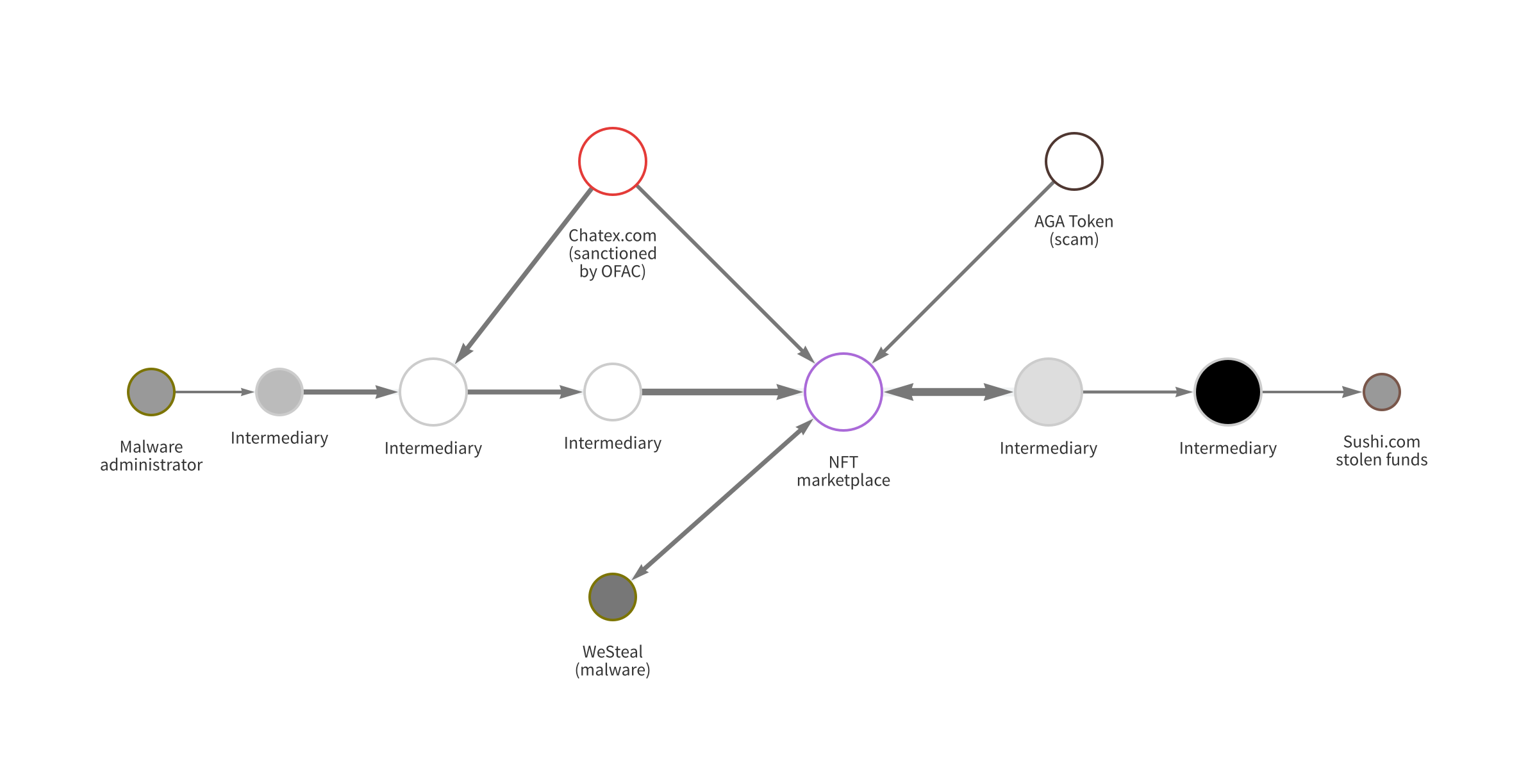Here, we can see addresses associated with several different types of cybercriminals interacting with a popular NFT marketplace, including malware operators, scammers, and Chatex.