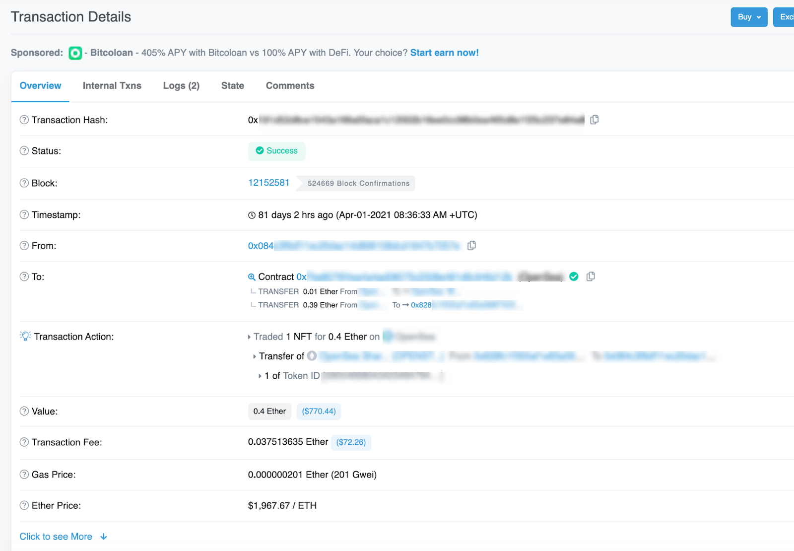 Let’s look more closely at Seller 1, the most prolific NFT wash trader on the chart above, who has made 830 sales to addresses they’ve self-financed. The Etherscan screenshot below shows a transaction in which that seller, using the address beginning 0x828, sold an NFT to the address beginning 0x084 for 0.4 Ethereum via an NFT marketplace.