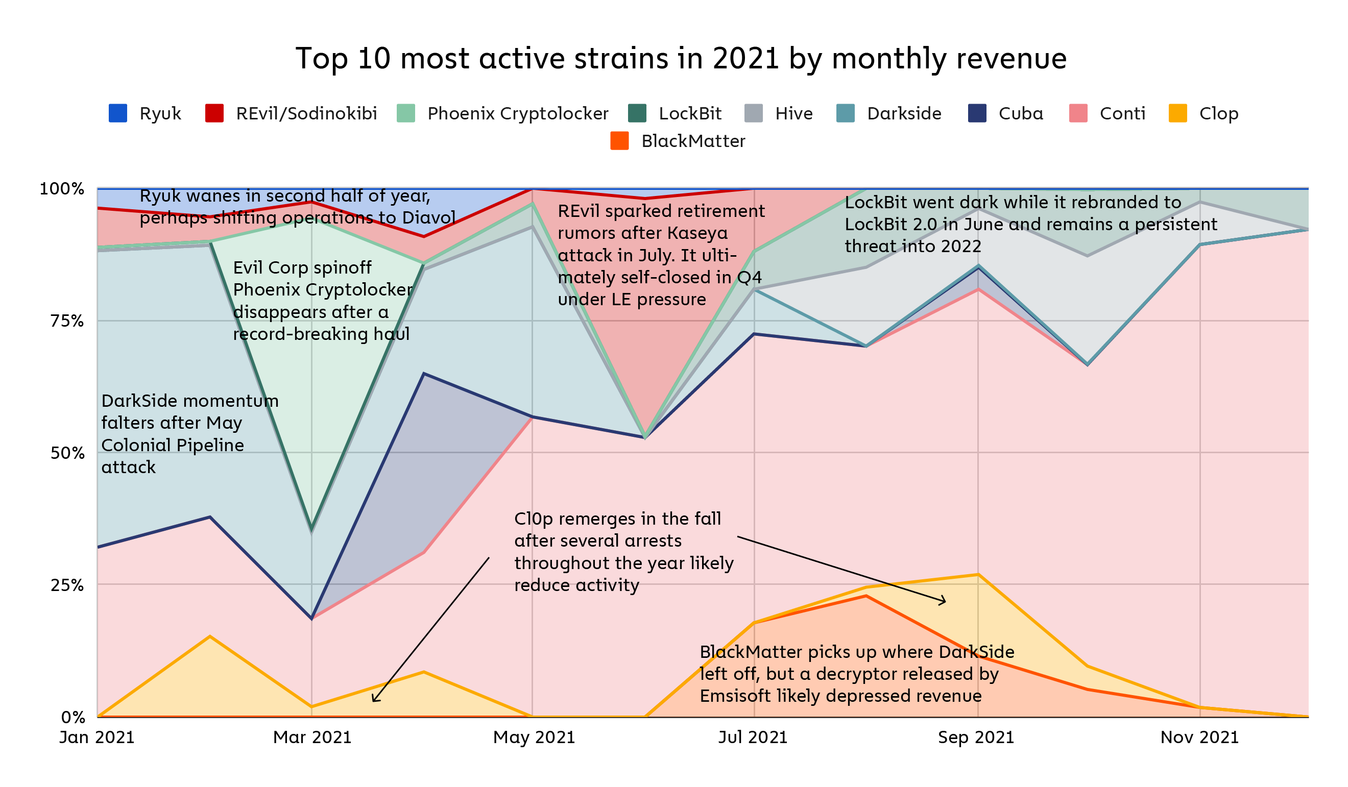 Conti was the one strain that remained consistently active for all of 2021, and in fact saw its share of all ransomware revenue grow throughout the year. Overall though, Conti’s staying power is increasingly outside the norm.
