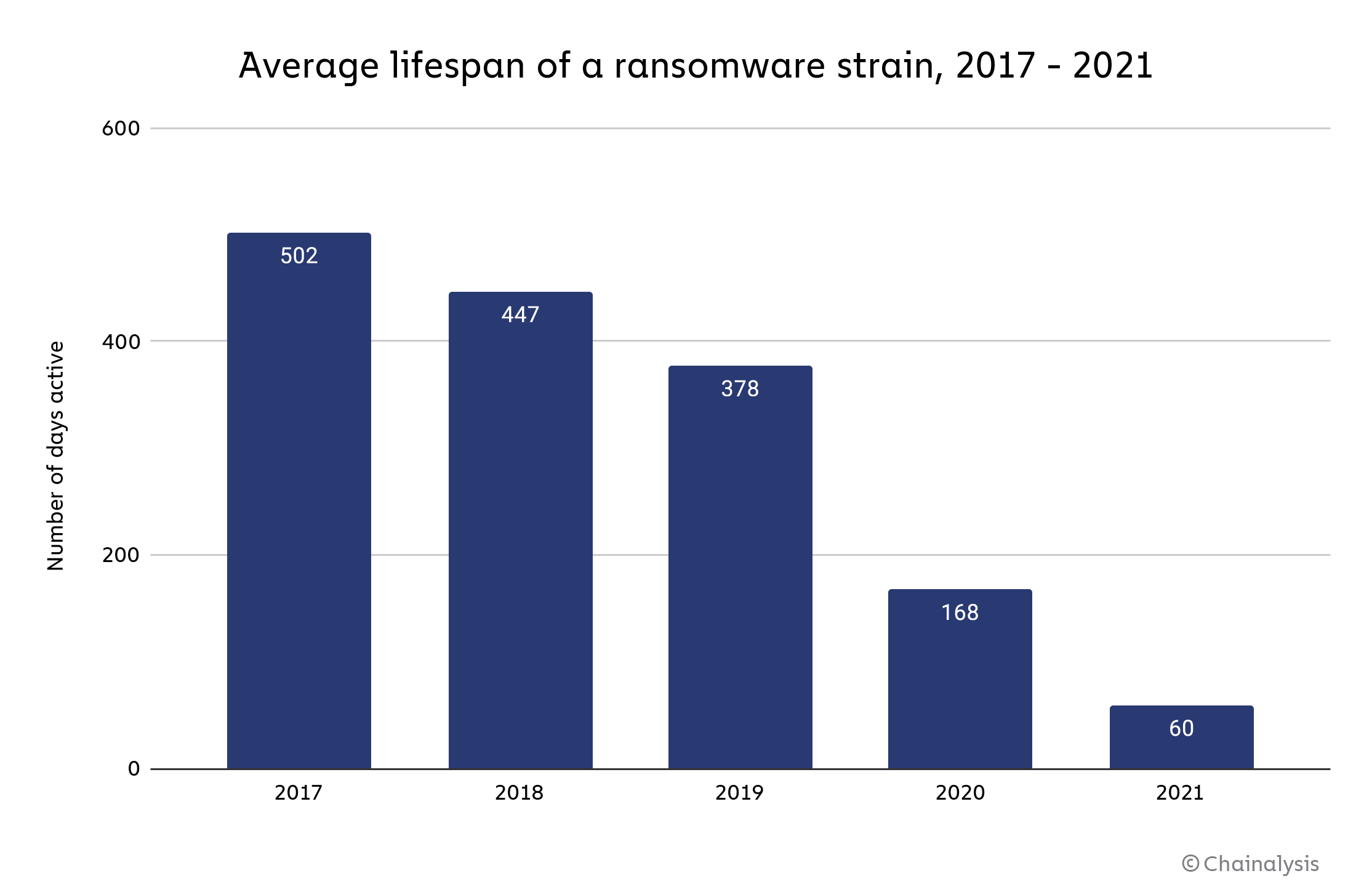 Two years ago, the average ransomware strain remained active for exactly one year. In 2021, the average strain is active for no more than two months. Why is the average ransomware lifespan dropping so quickly?