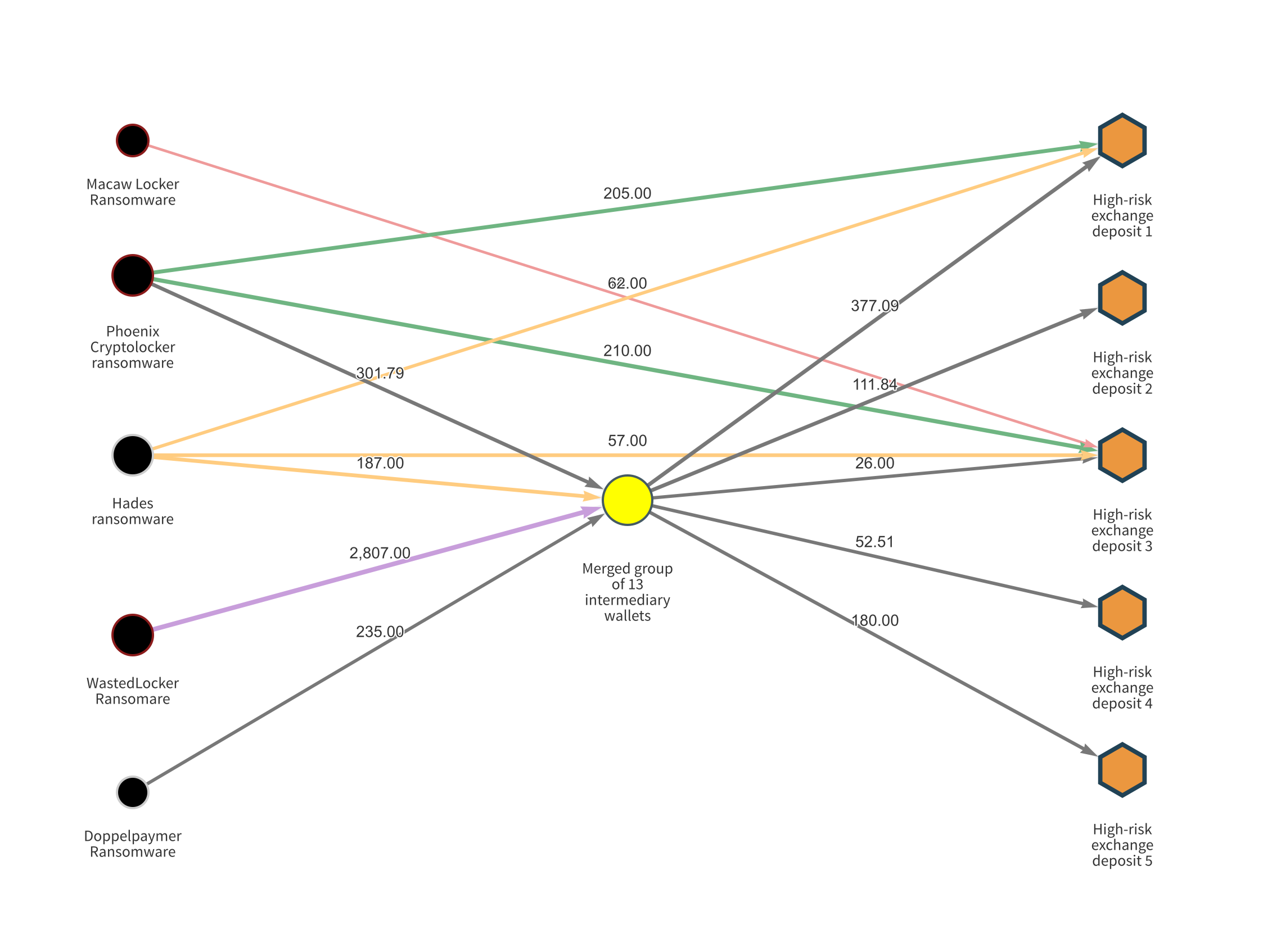 This graph shows the money laundering process for five of the Evil Corp ransomware strains we mentioned above. While all of them appear to be run by separate organizations, most send funds derived from attacks to the same group of intermediary wallets, and from there move funds to many of the same deposit addresses at high-risk exchanges.