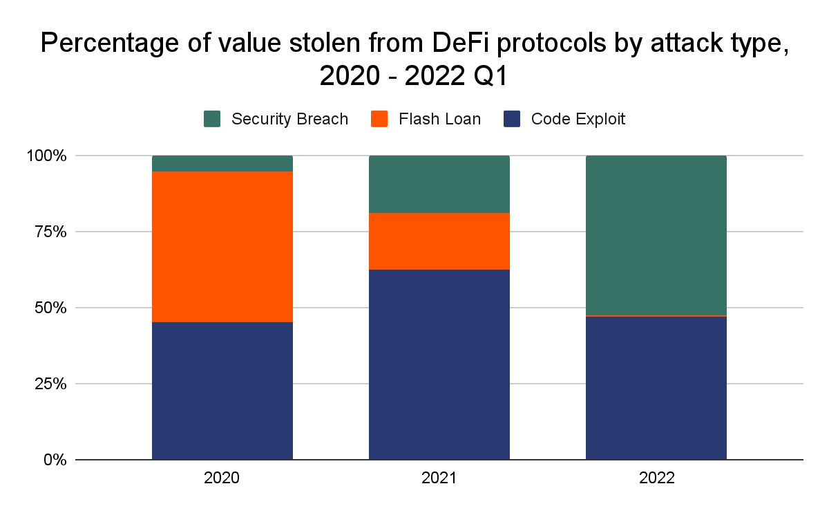 Almost 97% of all cryptocurrency stolen in the first three months of 2022 has been taken from DeFi protocols, up from 72% in 2021 and just 30% in 2020.