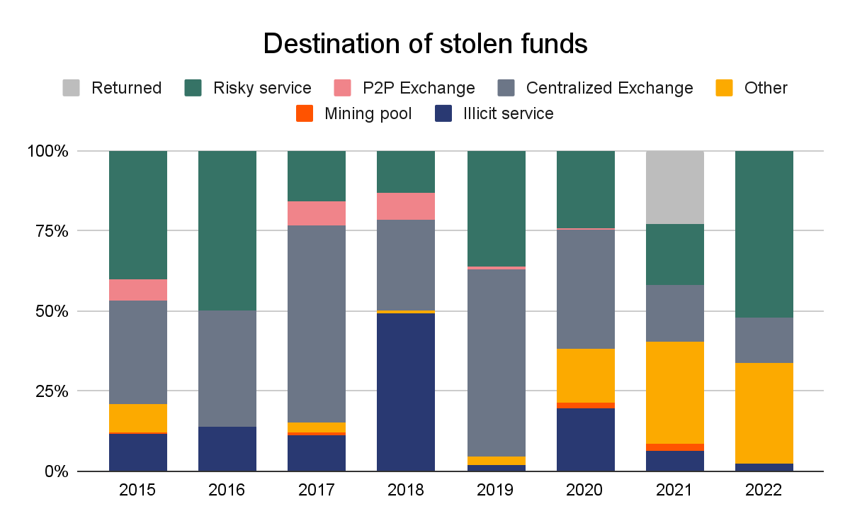 How do hackers launder stolen cryptocurrency? In 2021, more stolen funds flowed to DeFi platforms (51%) and risky services (25%) than ever before. Centralized exchanges, formerly a top destination for stolen funds, fell out of favor, receiving less than 15% of the total. This is likely due to exchanges’ embrace of AML and KYC processes, which threaten the anonymity of cybercriminals.