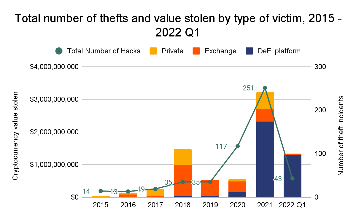 Our aggregate data further illustrates this fact. From 2020 to Q1 2022, 35% of all cryptocurrency value was stolen thanks to a security breach.