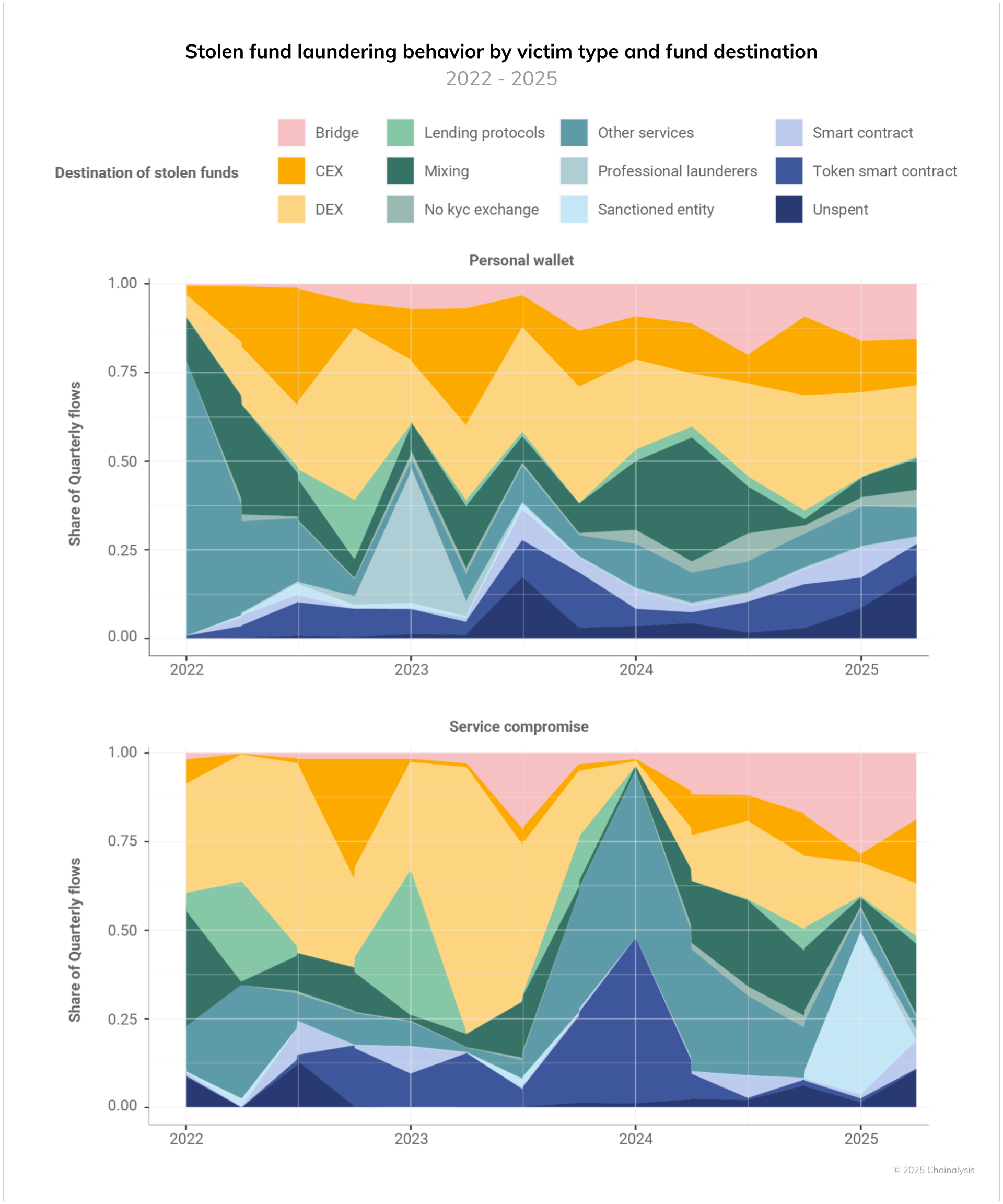 U暗号資産のエコシステムにおいて盗難資金の流れを把握することは、リアルタイムでの詐欺やハッキングの防止、さらには資産の差押えに関する対応を強化するうえで極めて重要です。当社の分析によると、個人ウォレットへの攻撃とサービス(例:中央集権型取引所など)への攻撃では、それぞれ異なるリスクプロファイルや運用要件が存在するため、資金洗浄行動にも明確な違いが認められます。