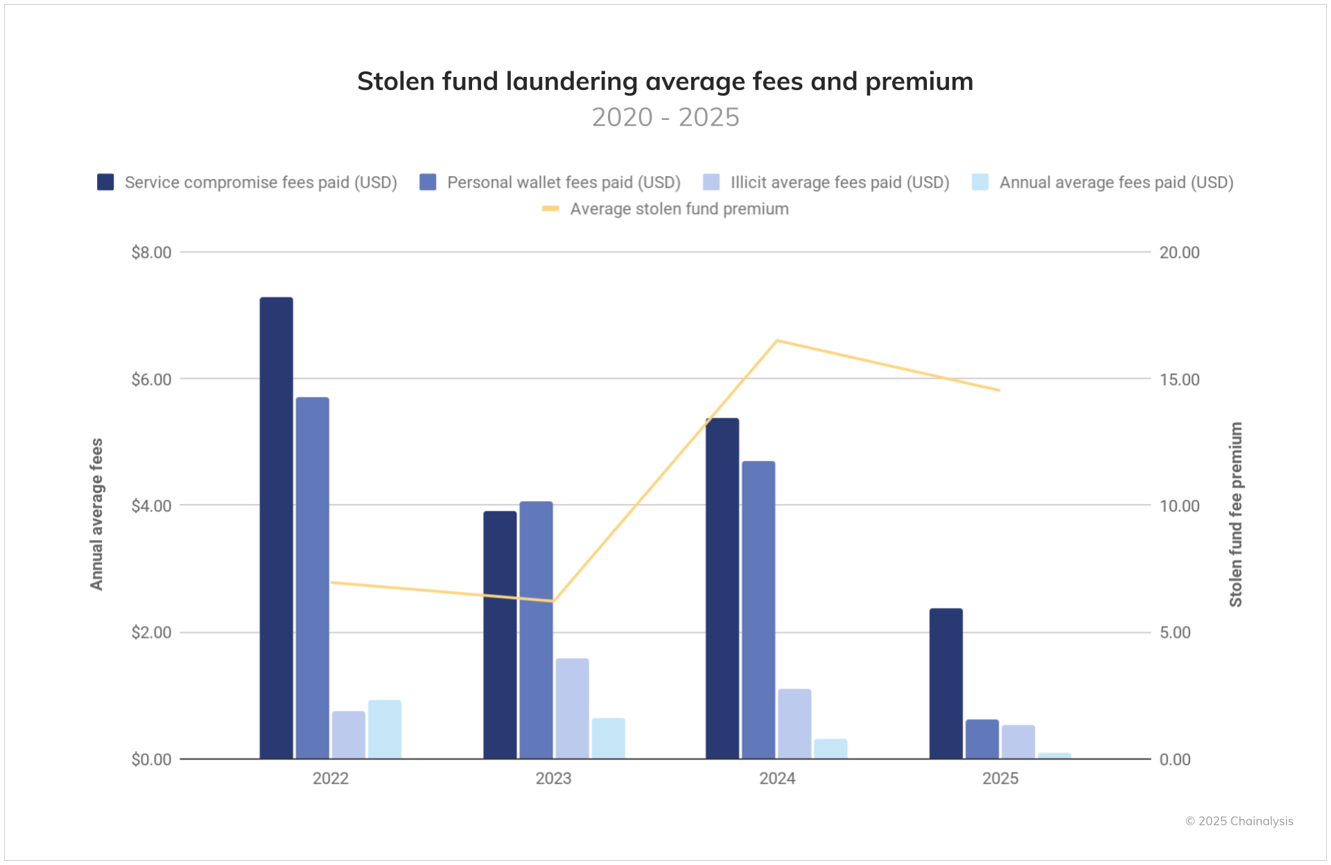• 盗難資金の洗浄者は、資金の移動に多額の費用をかけており、その平均プレミアムは2021年の2.58倍から2025年年初来で14.5倍に増加しています。