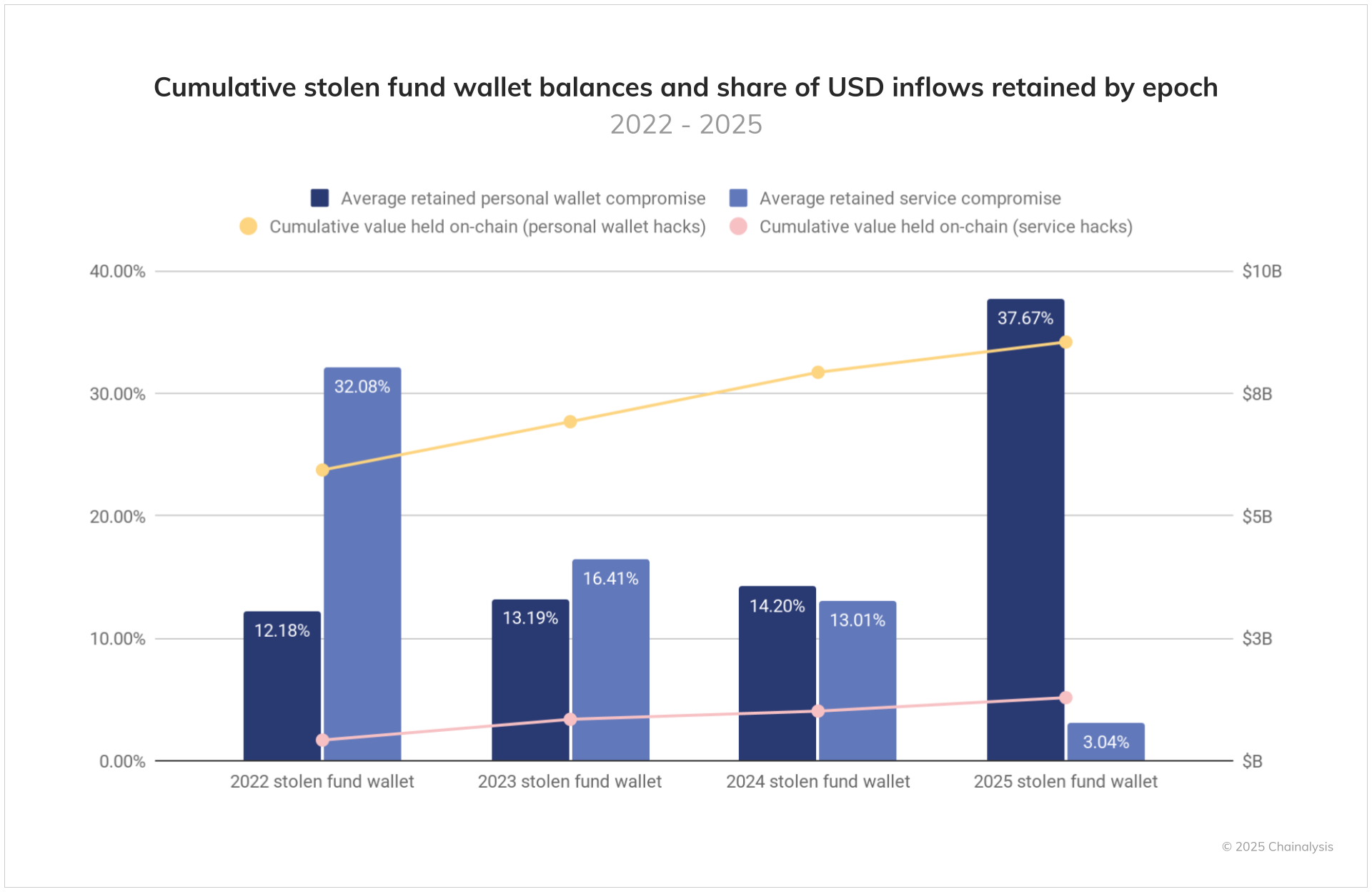 • 個人ウォレットを侵害するサイバー攻撃者には、盗んだ資産をすぐに洗浄せず、多額の盗難資金をオンチェーンに残しておく傾向が強まっています。現在、個人ウォレットを標的とした盗難による暗号資産は85億ドルがオンチェーンに保持されている一方、サービスから盗まれた資金は12億8000万ドルとなっています。