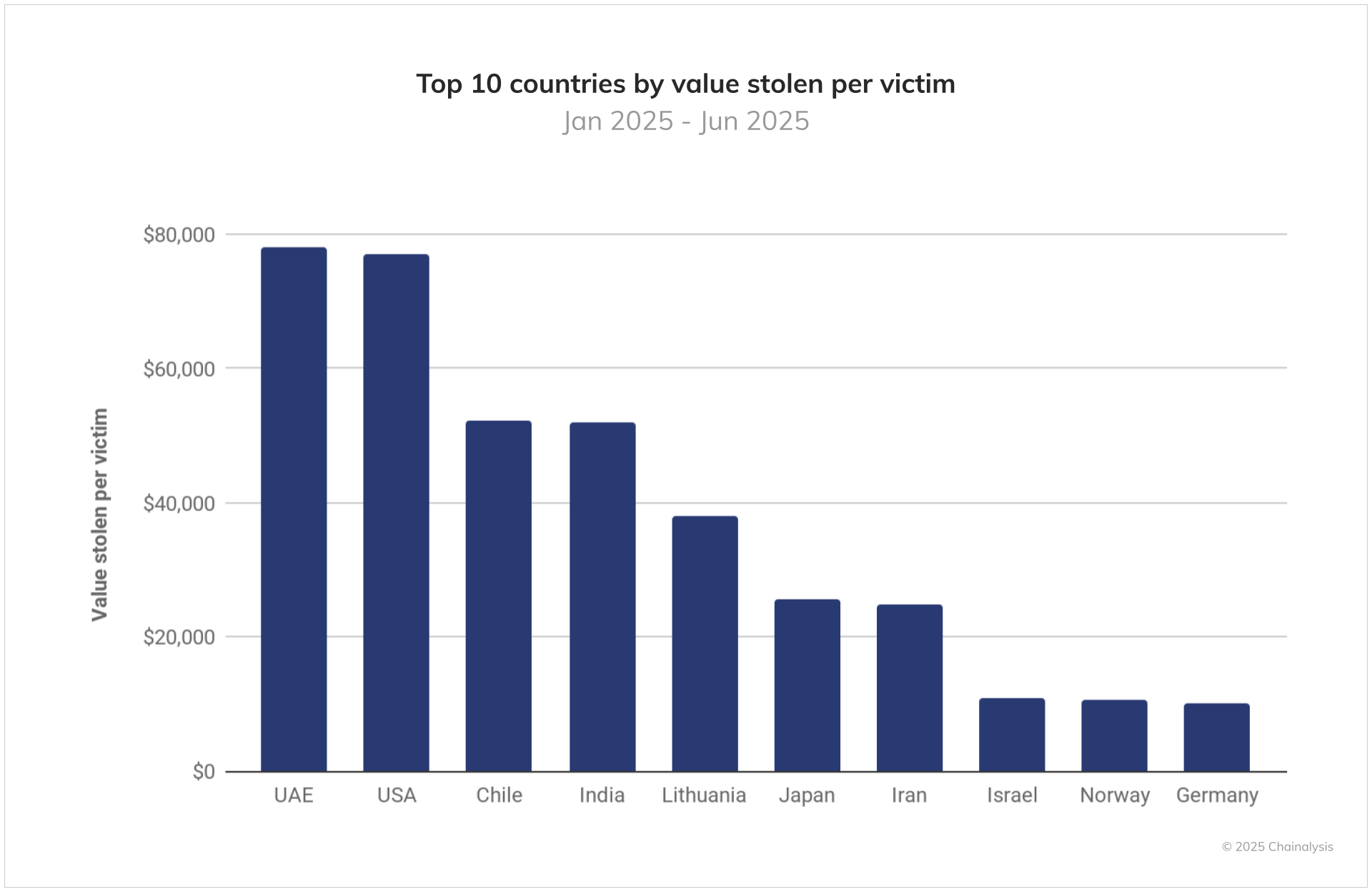2025年の分析では、被害者1人あたりの盗難額において、各国間で顕著な差異が明らかになりました。米国、日本、ドイツは引き続き高水準にありますが、アラブ首長国連邦、チリ、インド、リトアニア、イラン、イスラエル、ノルウェーといった国々が新たに上位にランクインし、世界的に深刻な被害状況が浮き彫りになっています。