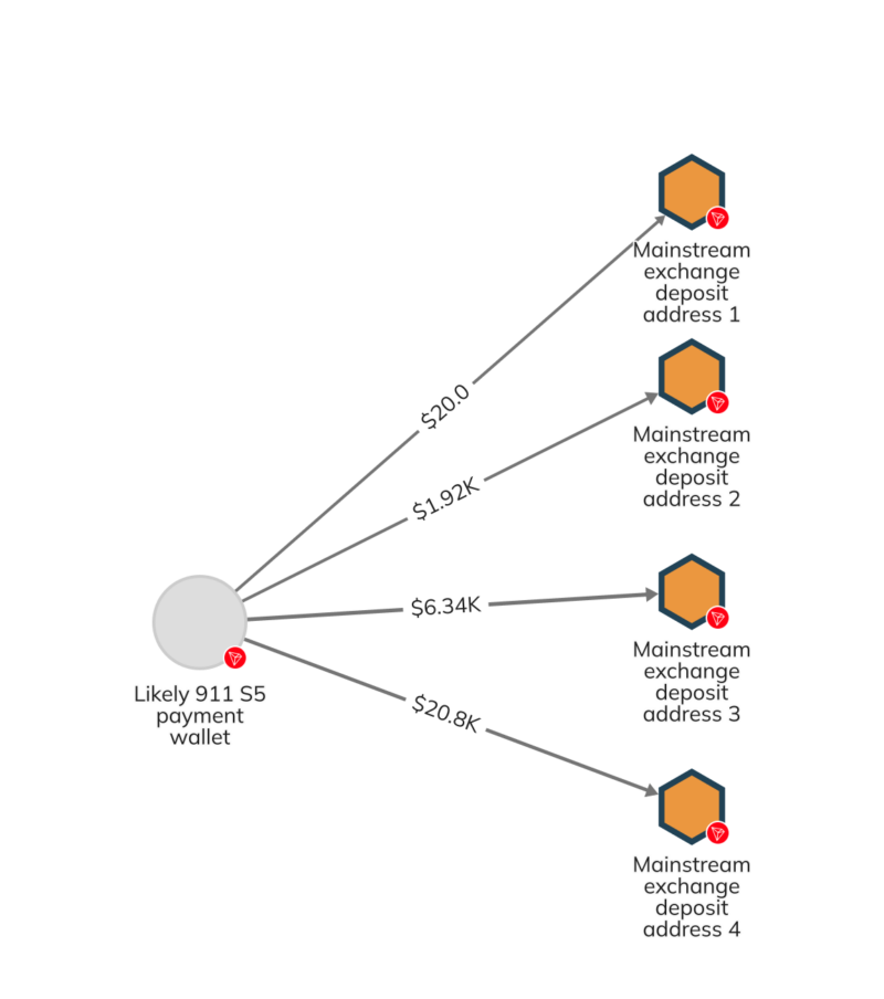 Those investigation tactics revealed the network of 911 S5 wallets we see on the Chainalysis Investigations graph below, which includes personal wallets used to receive payments from cybercriminal customers, exchange deposit addresses, and cold storage wallets utilized by 911 S5 administrators.