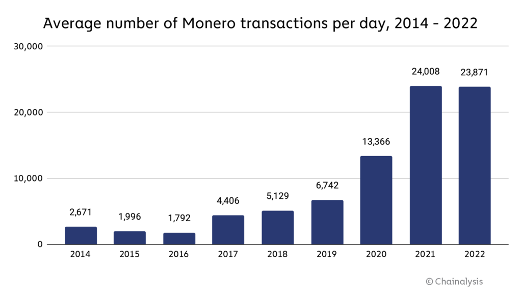 XMR activity doubled between 2019 and 2020, and experienced a similar increase between 2020 and 2021. As we see below, the past two years both had an average of around 24,000 transactions per day.