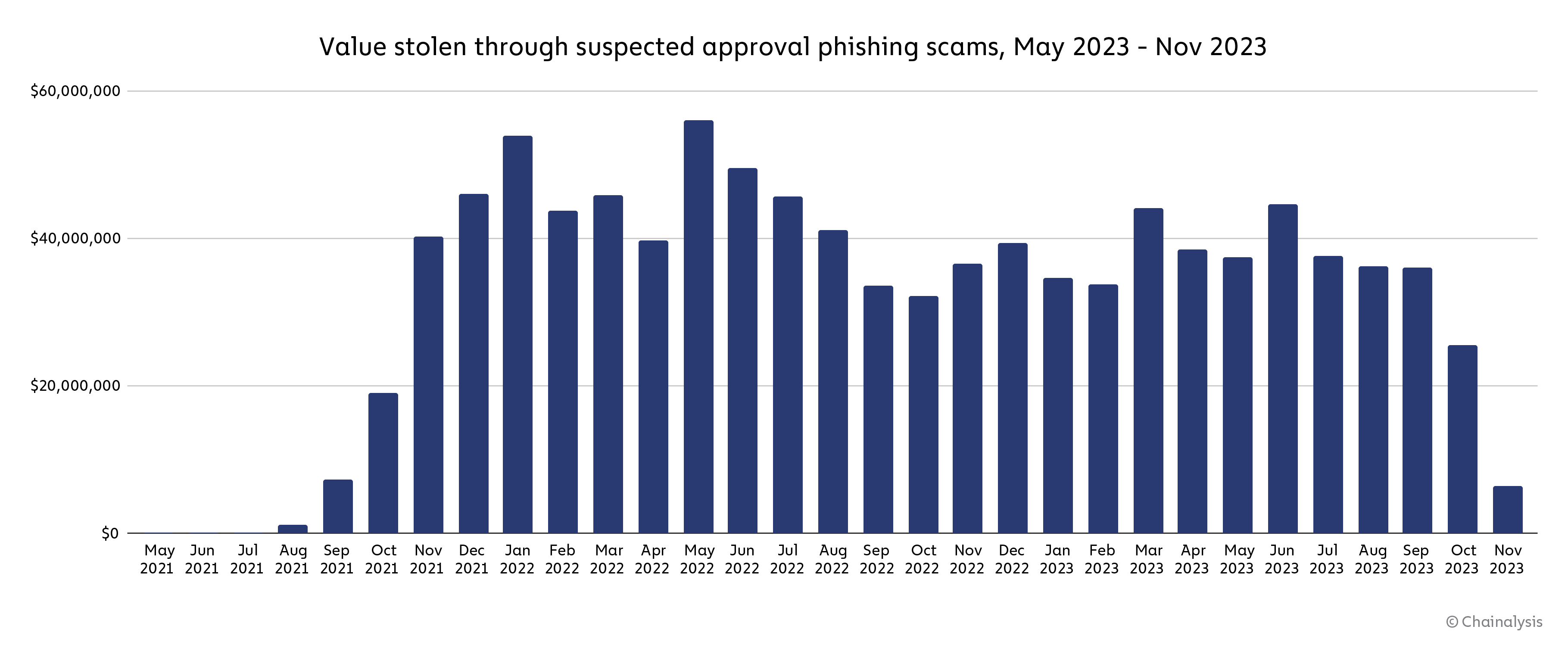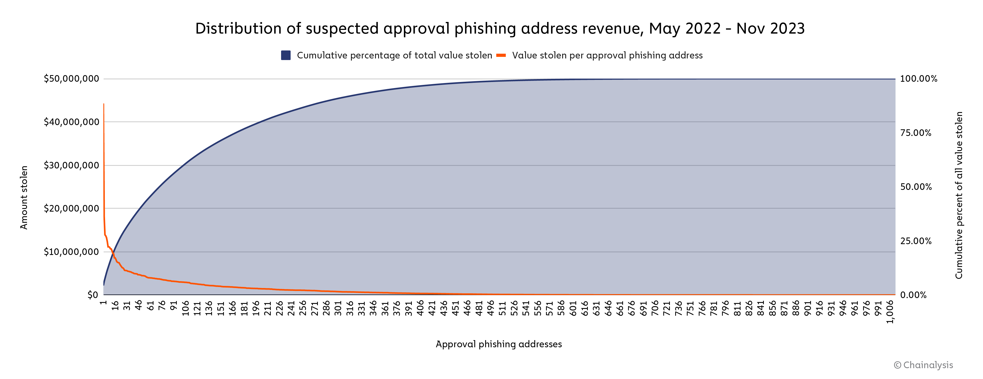 The suspected approval phishing scammers we’re tracking saw their revenue peak in May 2022. Overall, 2022 saw victims lose an estimated $516.8 million to approval phishing, versus just $374.6 million in 2023 through November. Like many forms of cryptocurrency-based crime, the vast majority of approval phishing theft is driven by a few highly successful actors. We can see this on the distribution graph below, which shows the approval phishing revenue of our 1,013 addresses during the time period studied, and the cumulative share of all value stolen through approval phishing by the addresses in our sample in descending order.