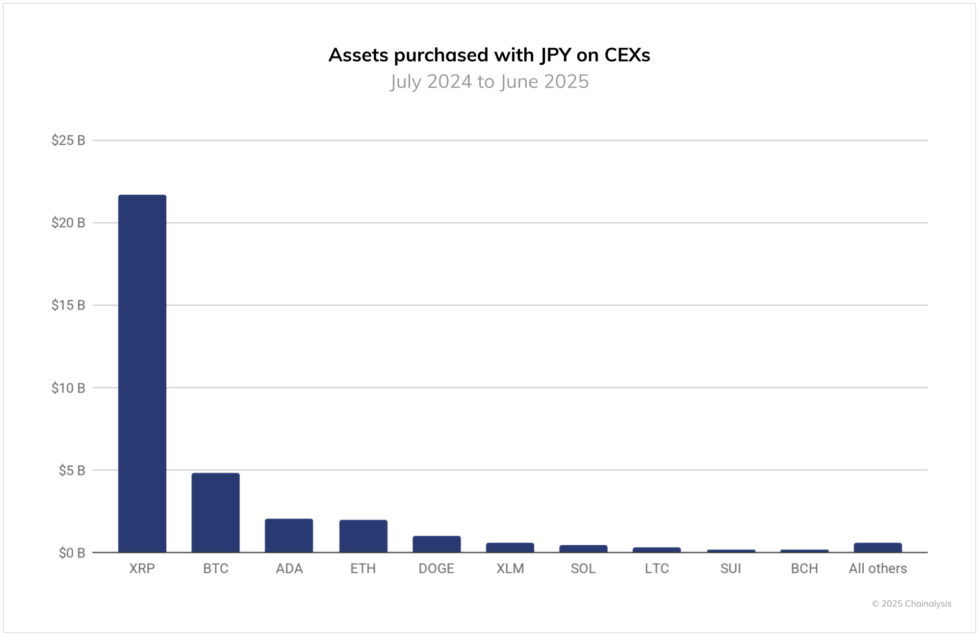 Japan’s growth is on the heels of important advances in its crypto industry. For some time now, regulatory restrictions have constrained the listing of stablecoins on domestic exchanges, although this is now beginning to change. Instead, over the 12 months to June 2025, cryptocurrency purchases using JPY have been channeled predominantly into XRP, which accounted for $21.7 billion in fiat trading activity, BTC ($4.7 billion) and ADA ($2.0 billion).* The dominance of XRP trading is particularly interesting, and suggests that investors may be taking bets on the real-world utility of XRP on the back of Ripple’s strategic partnership with SBI Holdings. Looking ahead, markets will be keenly watching how stablecoins such as USDC and JPYC gain traction.