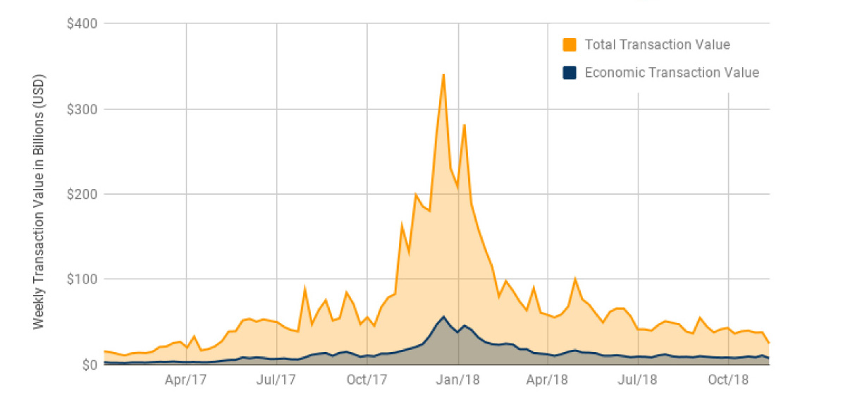 If so many addresses are created just to pass bitcoin between people and services, how much of the transaction value on the network is actually moving between economic addresses? We estimate that on average only 20% of the bitcoin transaction value is economic, in that it is a final transfer between different people via economically relevant addresses. The remaining 80% is returned as change. As you can see in the chart below, between August and October 2018, some $41 billion of transactions were executed — and only $9 billion had real economic value.