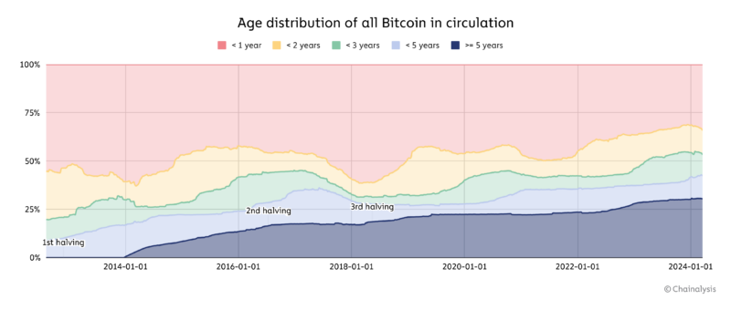 The percentage of Bitcoin held by long-term investors (more than 3 years) has shown consistent growth after each halving. Approximately one year after the first halving, the share of Bitcoin held for long-term investors increased by about 73%. The period following the second and third halvings showed modest increases, continuing an overall upward trend.