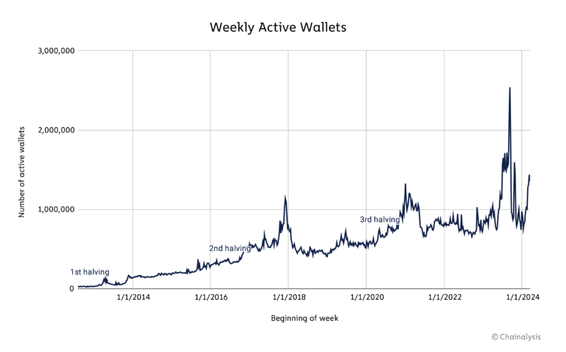 The consistent rise in weekly active wallets post-halving demonstrates the growing usage and adoption of Bitcoin.