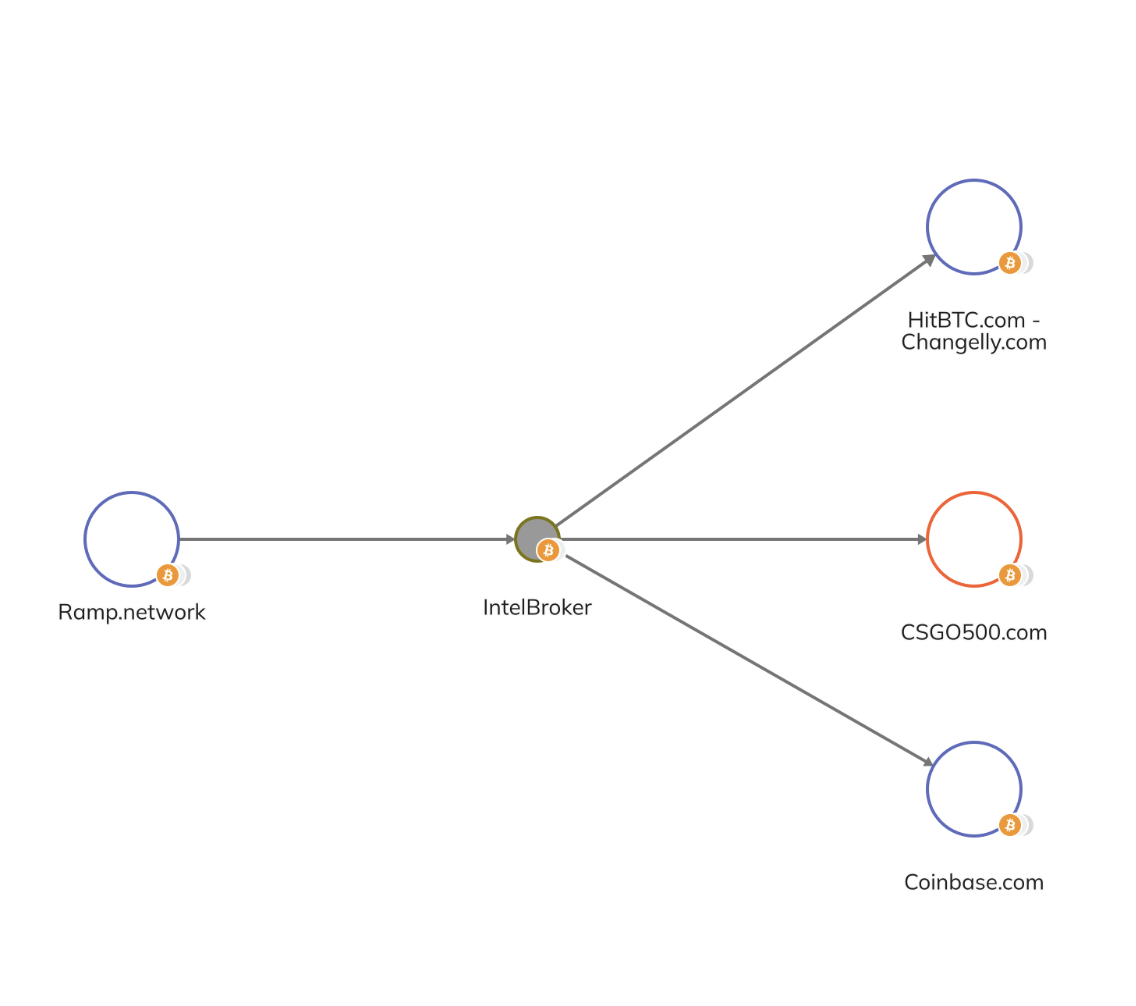 Cross-referencing revealed the same Bitcoin address had interacted with Coinbase. Account data showed the Coinbase account was opened under ‘Kyle Northern’, but KYC data ultimately linked back to ‘Kai West’. Analysis also revealed small deposits to CSGO500, an online cryptocurrency casino, and that an Ethereum address IntelBroker advertised (0x0cD1FD1191aeC66F555C0893D29E7c36AeEeb6ab) sent all funds to Changelly exchange.