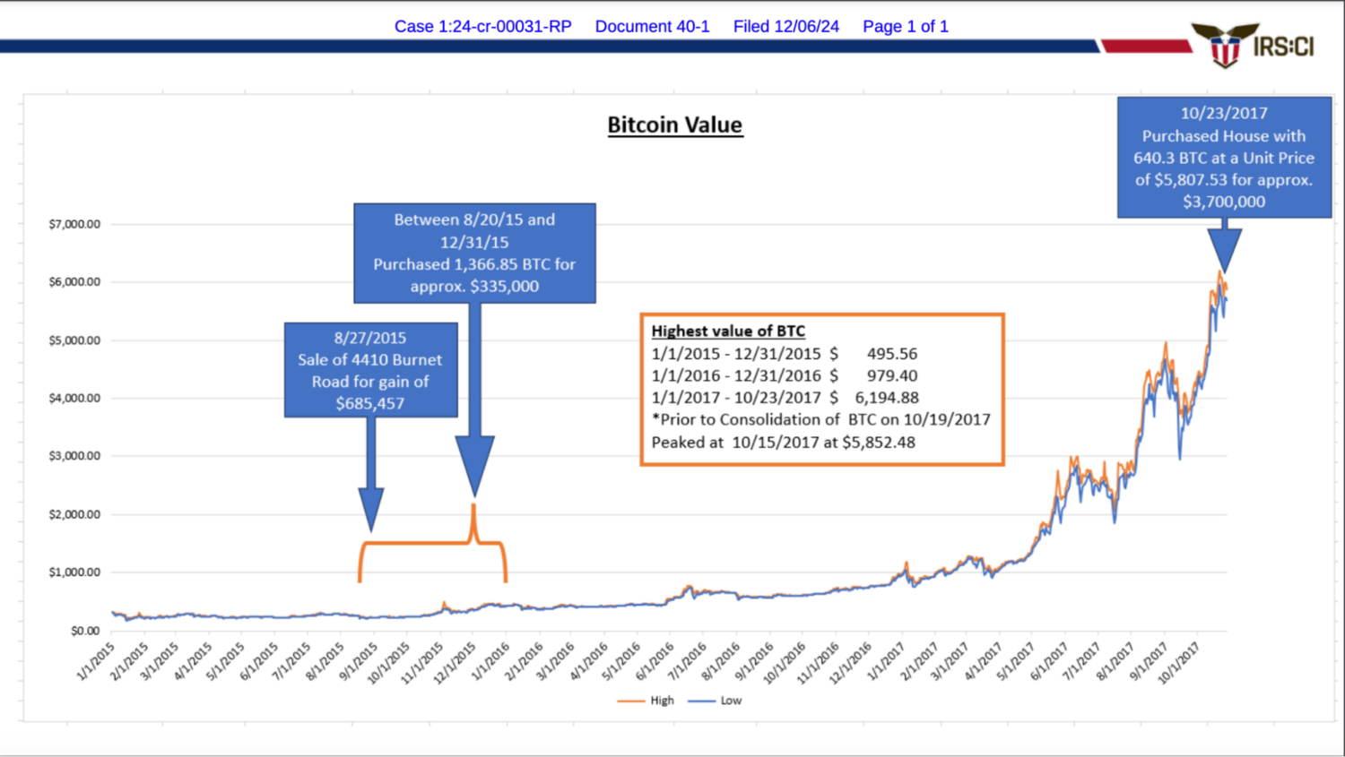 Chainalysis’ expert analysis provided a sequential flow of funds across numerous wallets, assisting in confirming timestamps and valuations. In 2015 — when BTC’s highest value was approximately $495.56 — Ahlgren purchased approximately 1,366 BTC. In 2017, he sold approximately 640 BTC (then worth approximately $5,807.53 per unit) for a total of approximately $3.7 million. To offset the substantial gains on the BTC he sold to purchase his Park City house, Ahlgren filed a return that falsely inflated his cost-basis of the BTC to falsely lower his tax liabilities.