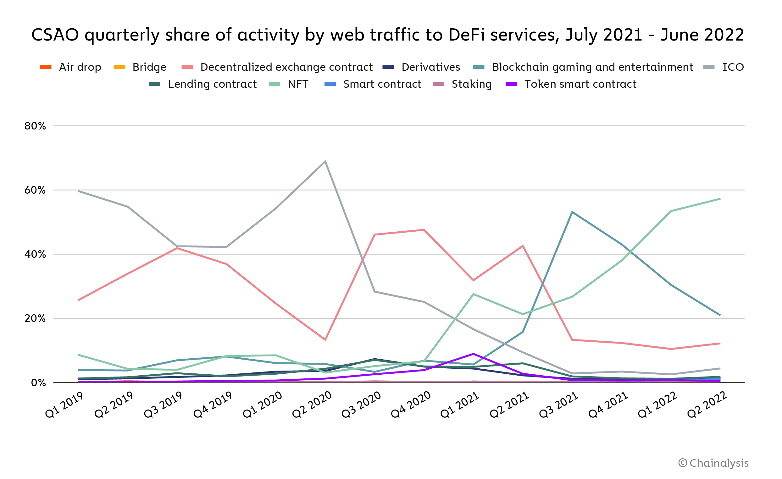 For instance, web traffic patterns suggest NFTs are perhaps the biggest on-ramp into DeFi for CSAO today. 58% of DeFi-related web traffic from CSAO users in Q2 2022 was NFT related; another 21% was to the websites of play-to-earn blockchain games.