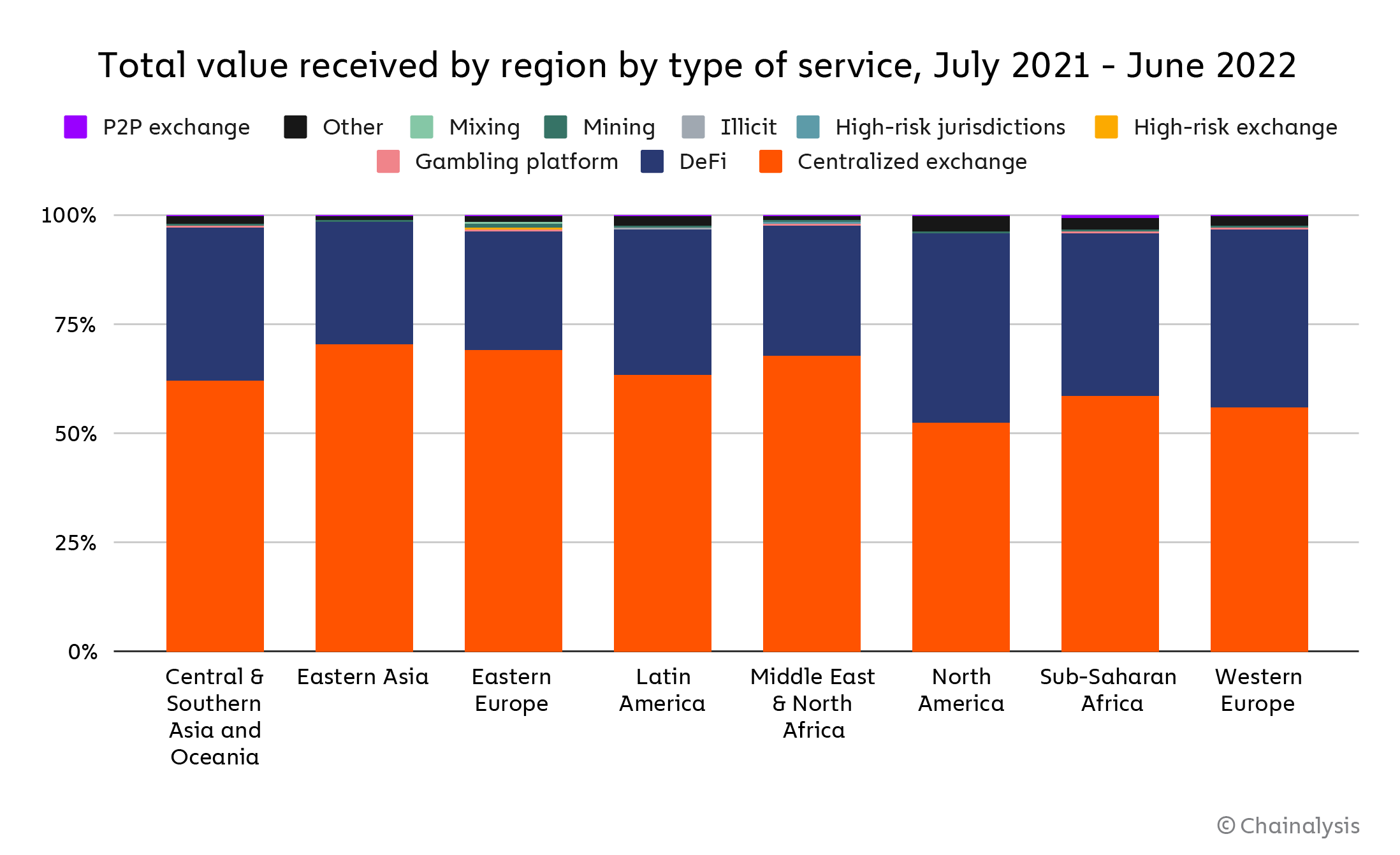 Like other regions, CSAO sees the majority of its crypto activity happen on centralized services. Based on transaction volume, the region is in the middle of the pack when it comes to DeFi adoption. But the data gets more interesting when we dig into what’s driving that DeFi adoption.