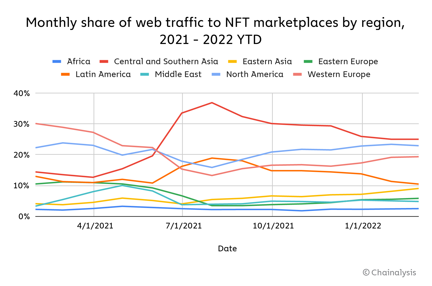 Analysis of web traffic to popular NFT platforms reveals that the asset class attracts users from all over the globe.