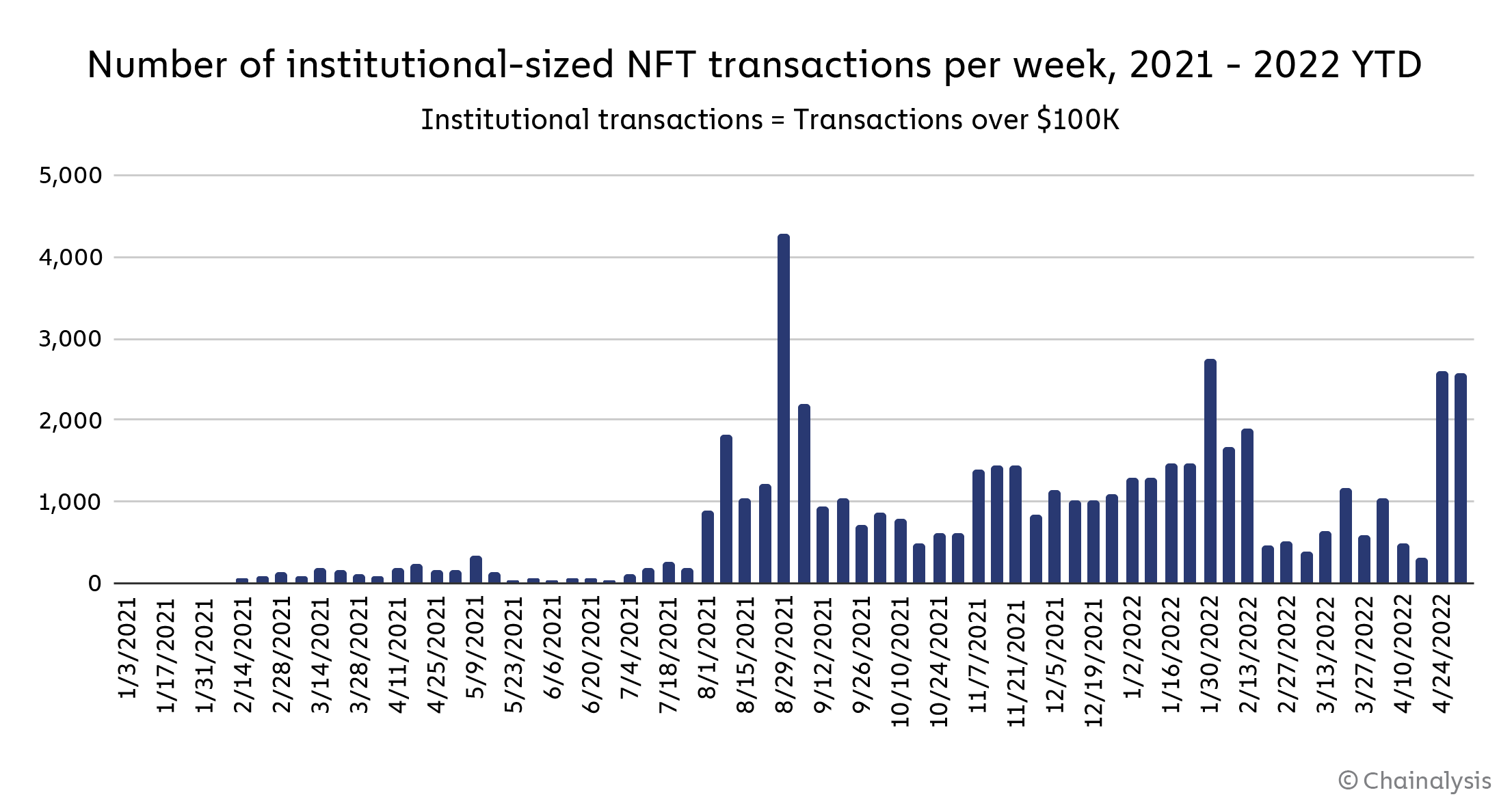 However, as is the case with the NFT market as a whole, the growth of institutional-sized NFT transactions hasn’t been consistently sustained.