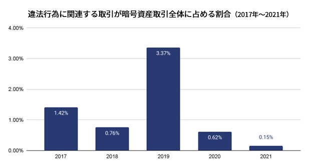 暗号資産ベースの犯罪は依然として解決すべき重要な問題です。特に全体的な取引量の増加は、違法な取引の額も上昇していることを意味します。しかしながら違法な活動が暗号資産エコシステムの中で占める割合はここ3年でだいぶ低くなってきています。