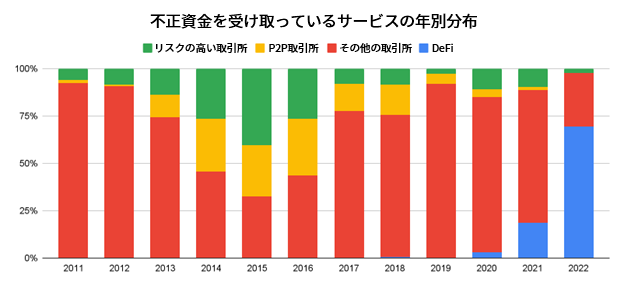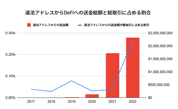 マネーロンダリングもまた、深刻な問題です。過去2年間、違法なアドレスからサービスに送金される資産に占めるDeFiプロトコルの割合が、拡大し続けているからです。