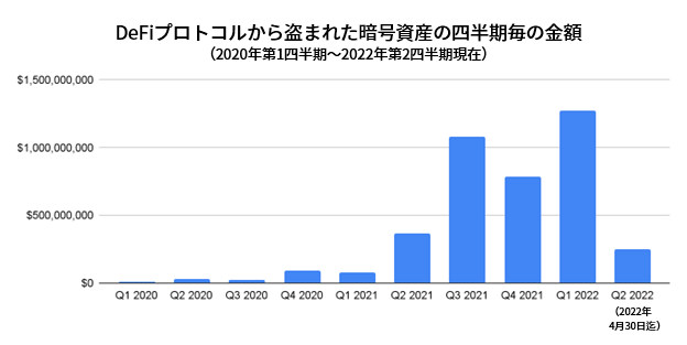 DeFiプロトコルにおける盗難金額は、2021年の初めから上昇傾向が見られ、Ronin BridgeWormhole Networkに対するハッキングがこれに拍車をかけ、2022年の第1四半期には過去最高の水準に達しました。