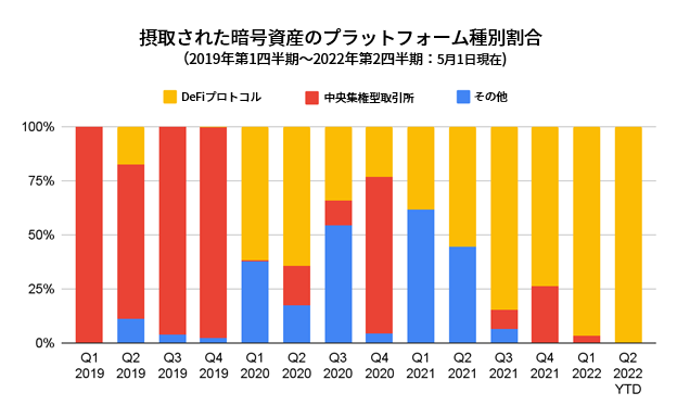 2020年当初以降、暗号資産プラットフォームでの盗難資産に占めるDeFiプロトコルの割合は急速に拡大し、2021年には窃取された資産の大部分を占めるようになっています。5月1日時点で、2022年に入ってから盗まれた16億8,000万ドル相当の暗号資産の97%は、DeFiプロトコルで占められています。