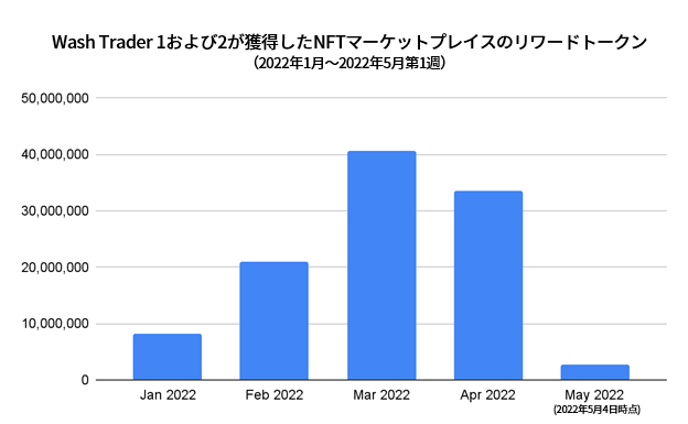 Chainalysisの「2022年暗号資産関連犯罪レポート」では、NFT市場におけるウォッシュトレード(仮装売買)の実例を調査しました。ほとんどのウォッシュトレーダーが、取引手数料の支払によって損失を被る結果に終わっていますが、一方で、NTFの価格を人為的につり上げ、そうとは知らないユーザーに押し付けて多額の利益を得ているトレーダーも存在することが分かりました。それでは、従来のウォッシュトレードとは、ある重要な点で目的が異なる別のNFTウォッシュトレードのスキームについて、以下に見ていきましましょう。このスキームの目的は、特定のNFTの価格をつり上げるのではなく、ウォッシュトレーダーが利用するNFTマーケットプレイスが提供している、リワードトークンを集めることにあります。