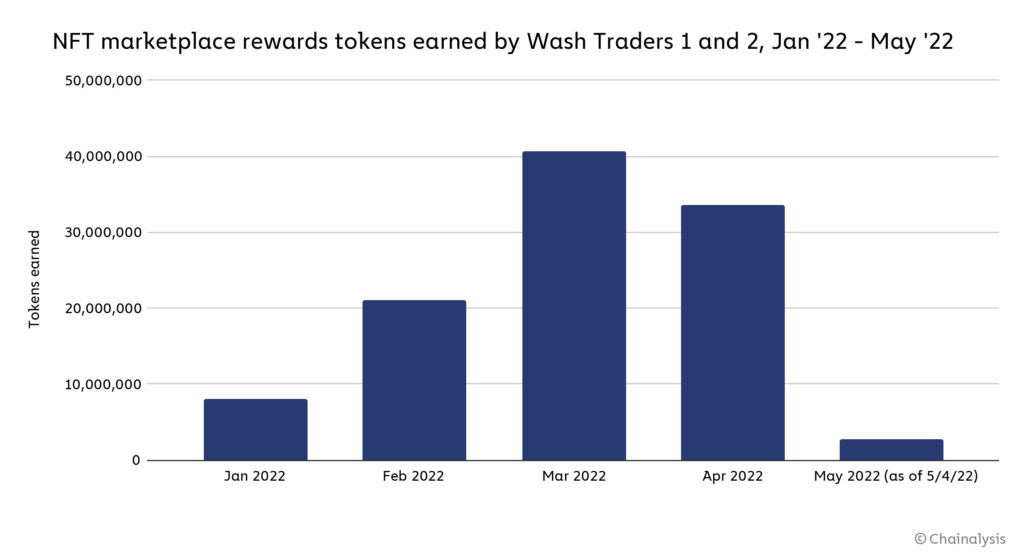 In our 2022 Crypto Crime Report, we looked at examples of wash trading in the NFT market, and found that while most wash traders ended up losing money due to gas fees, the most successful ones turned large profits by artificially inflating their NFTs’ values and offloading them to unsuspecting users. Now, we’re going to look at another NFT wash trading scheme whose goals differ from conventional wash trading in one key way: Rather than inflating the value of any particular NFT, the goal of this scheme seems to be collecting reward tokens given out by the NFT marketplace used by the wash traders.