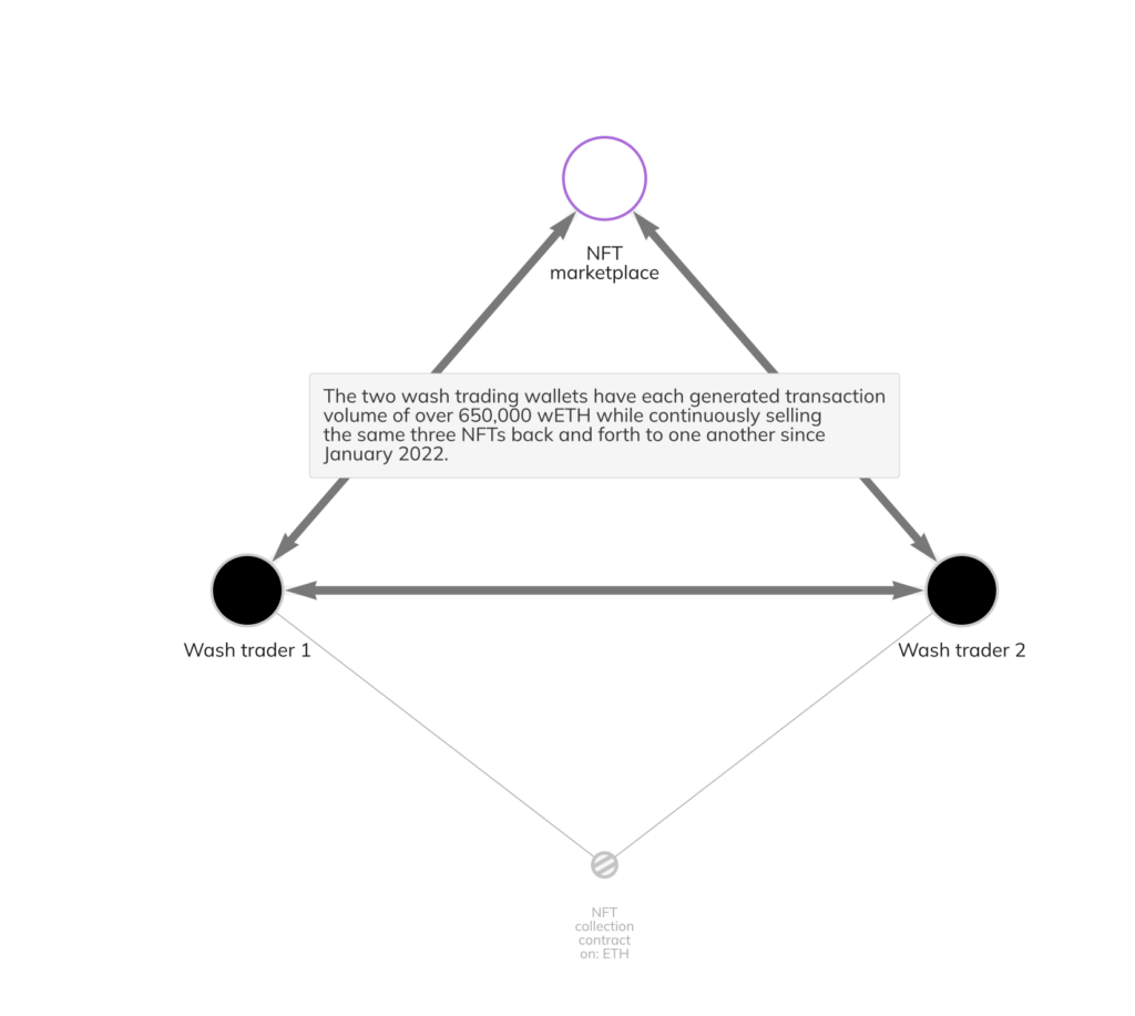 Now, on to our example. Below, we see two wallets, which we’ve labeled Wash Trader 1 and Wash Trader 2, that have generated over 650,000 wETH in transaction volume each while selling the same three NFTs back and forth to one another.