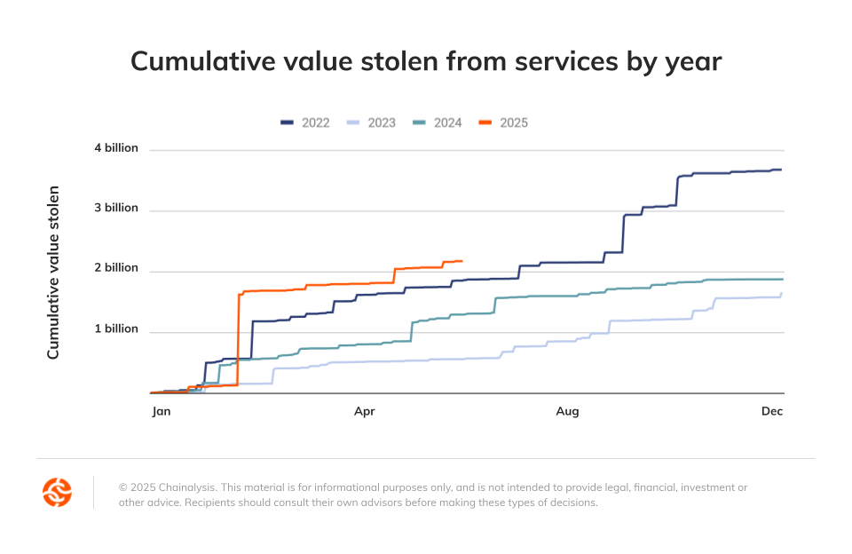Value stolen from services cracked $2.17 billion in the first half of 2025 and is trending toward the worst year on record. But service compromises tell only part of the story. Our mid-year crime update details the growing trend of personal wallet compromises, which make up a larger and larger share of all value stolen each year.