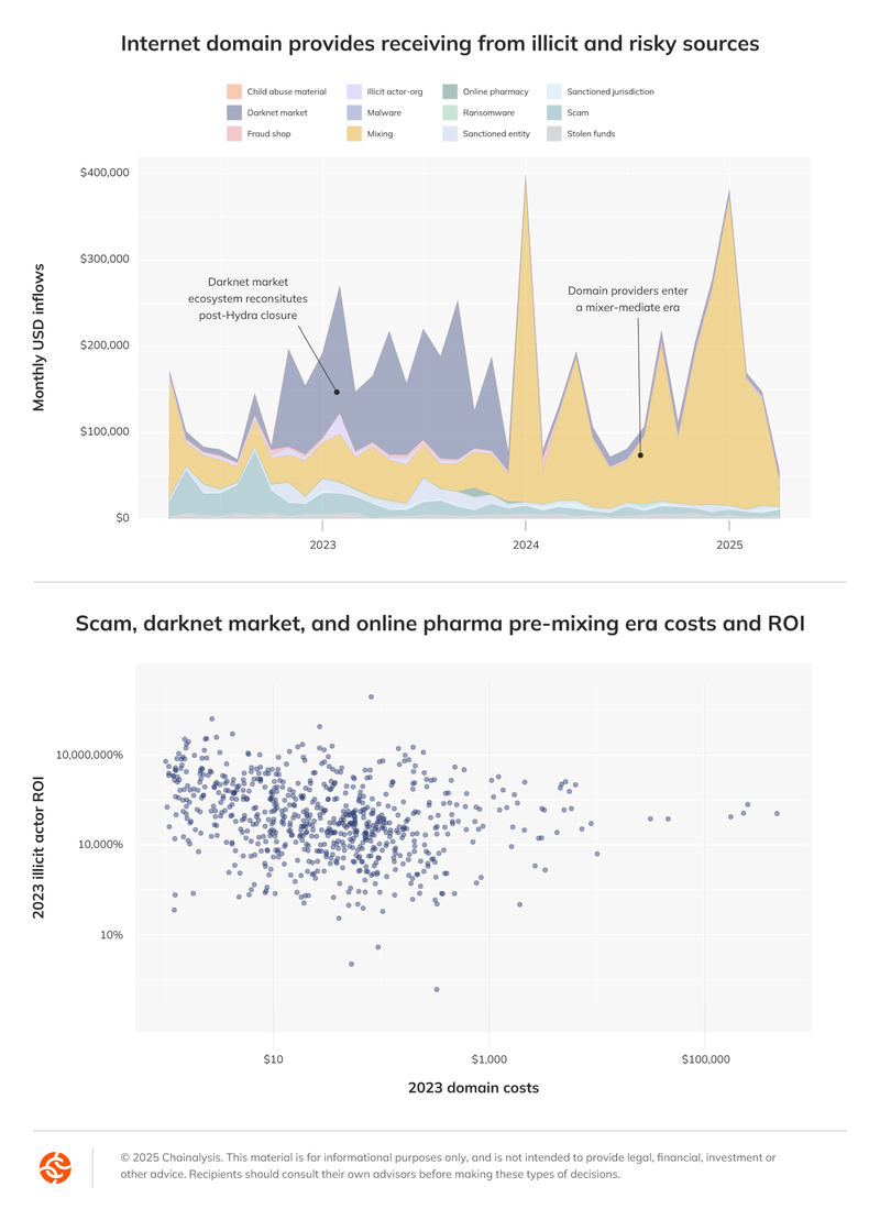 Our analysis reveals alarming trends in how illicit actors are exploiting legitimate domain services, with cryptocurrency mixers increasingly serving as intermediaries for criminal transactions. The ROI analysis is striking: darknet markets achieve a median 700,000% return, while scam operations generate over 82,000% returns, both requiring minimal domain infrastructure investment. In the post-Hydra landscape, these trends highlight the growing challenge of protecting legitimate web services from criminal exploitation.