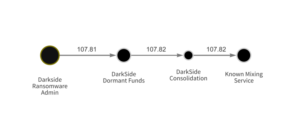 上のChainalysis Reactorのグラフは、2021年5月にあったColonial Pipelineへの攻撃に関するランサムウェアの一種であるDarkSideが行った最近の取引を示しています。攻撃の直後Darkside管理者は、資金をChainalysisが「DarkSide Dormant Funds」と名付けた仲介ウォレットに移し、2021年10月21日までそこに置いていました。その日、資金は2番目の仲介ウォレット(DarkSide Consolidation)に移され、さらに約1時間後にはミキサーに移されました。(ミキサーの具体名は法執行機関による捜査が継続中であるため非開示情報となっています)