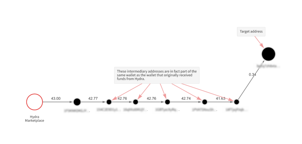 ミキサーはブロックチェーン分析において必ずしも行き止まりではなく、資金がこうした難解なサービスを経由したとしても、追跡を続けることができる場合もあります。しかし、そのためには取引がミキサーを経由しているということ、そして捜査の対象となるアドレスがミキサーに属するものとして識別される必要がありますが、そうした紐付けは専門のブロックチェーン分析ツールを使用しない限り不可能です。ミキサーが適切に識別されないとどう問題になるのか、実際の例を見てみましょう。