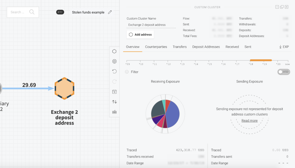 上記の例で見たように、犯罪者は捜査の網から逃れるために中間ウォレットを介して暗号資産を移動させることがよくありますが、アドレスが新たに資金を受け取ったかはブロックチェーン上で簡単に分析できるため、このような取引はほとんどのブロックチェーン分析ツールで比較的容易に追跡できます。しかし、資金が取引所のようなサービスに流れ込んだ場合、調査は困難になります。なぜなら、サービスが管理する入金アドレスに資金が到着した後に資金がどこに送られたかを追跡することは不可能だからです。Chainalysisが提供しているような識別情報無くしては、ブロックチェーンは真に信頼できる情報ソースとは言えません。