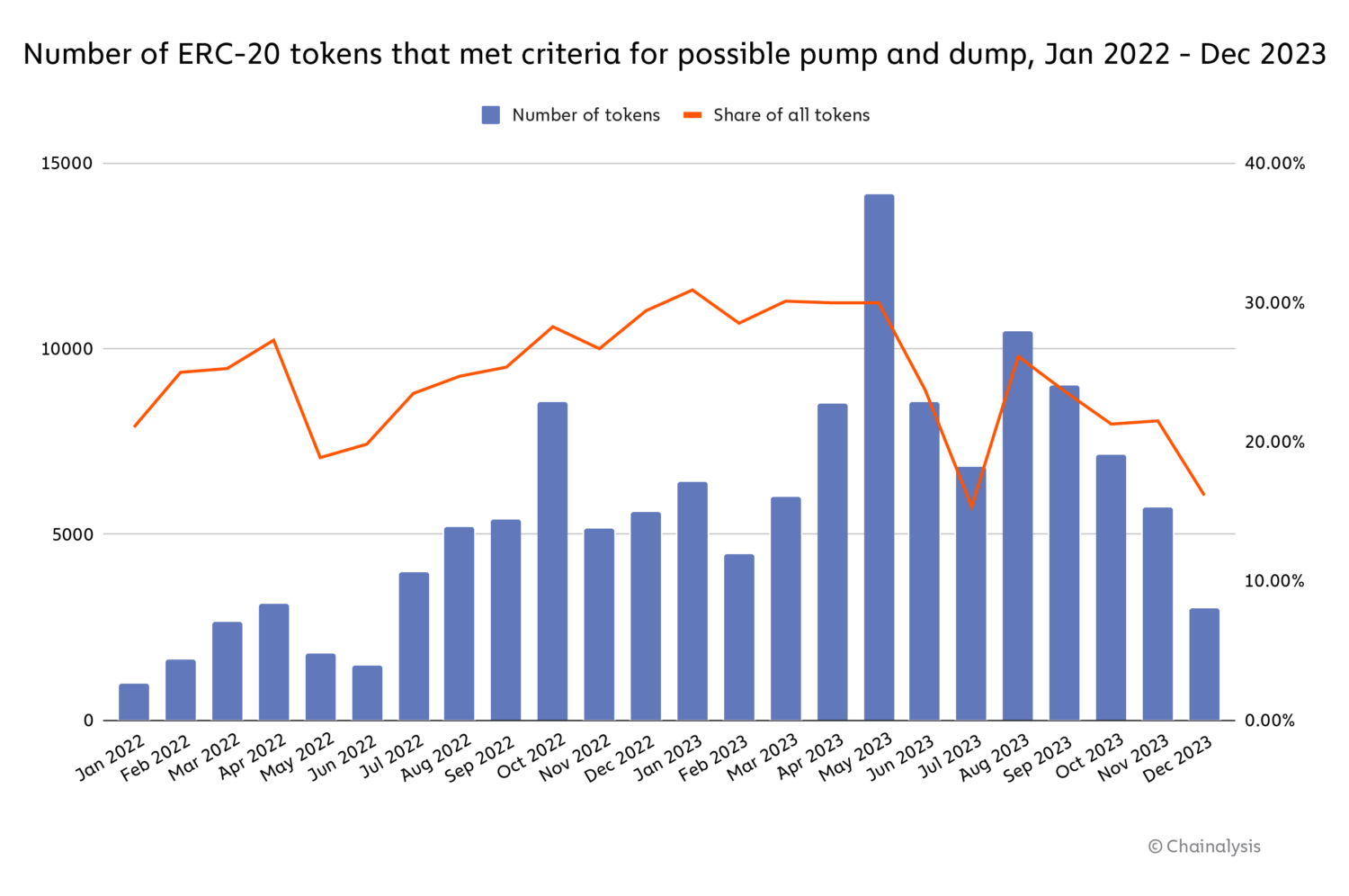 Between January and December 2023, just over 370,000 tokens were launched on Ethereum, approximately 168,600 of which were available to trade on at least one decentralized exchange (DEX). As we see below, the number of monthly tokens launched has been increasing since mid-2022, with recent spikes in activity nearing 50,000 per month.