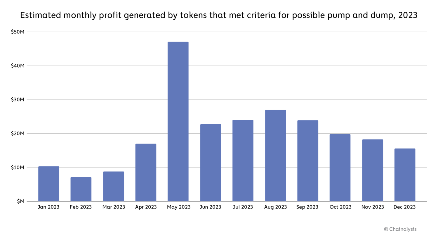 Although the total profit amassed by these actors is significant, individual tokens meeting our criteria on average produce just $2,672 each in profit and account for just 1.3% of total Ethereum DEX trading volume for 2023. The data paints a picture of an ecosystem in which potentially bad actors could generate tens of thousands of potential pump and dump tokens, most of which fail to generate significant profit and don’t attract meaningful trading volume.