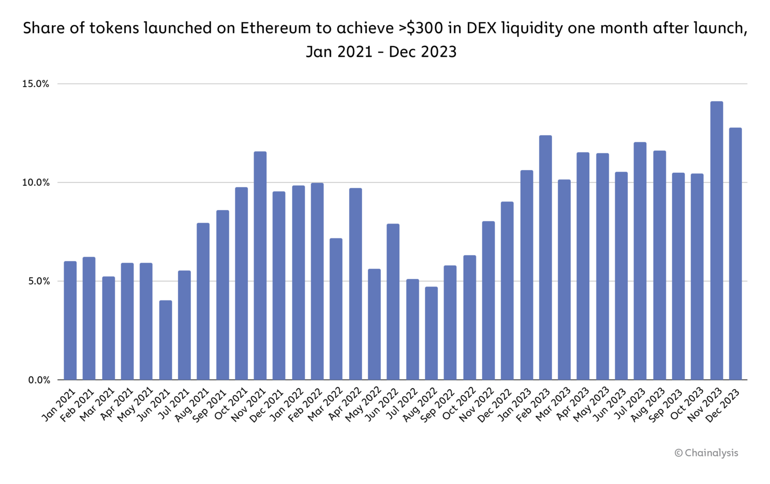 Not all of those tokens get significant traction, though. In any given month, fewer than 14.1% of all tokens launched achieve more than $300 of DEX liquidity within the subsequent month, and only 5.7% of tokens launched in 2023 are currently above that threshold. Although this is an increase from the previous two years, low liquidity values suggest that the majority of tokens launched still cannot be easily exchanged with liquid assets such as ETH, wETH, USDC, USDT, and wBTC without having their prices significantly affected.