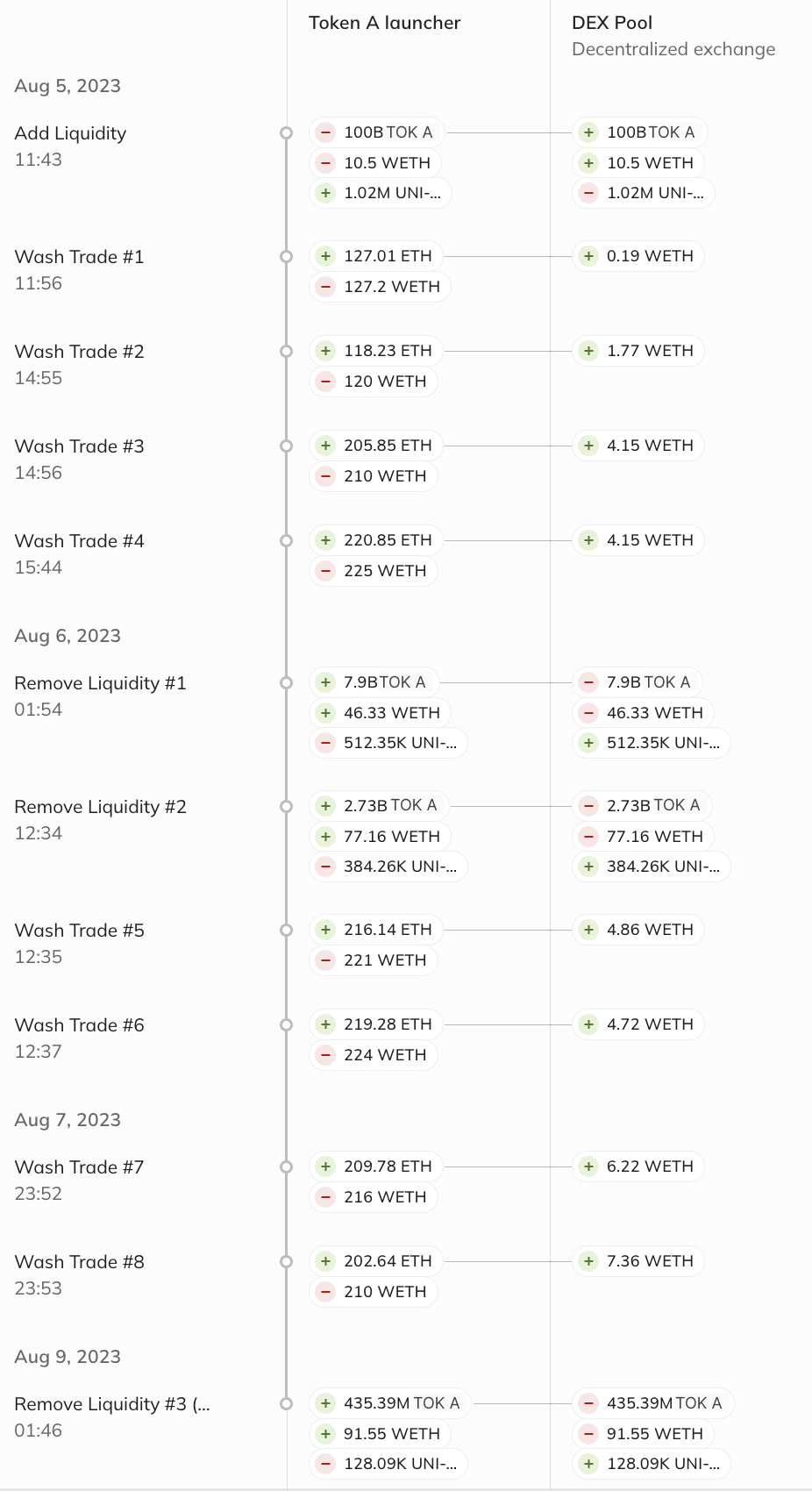 We can see a breakdown of how this address operator successfully executed these activities and more using Chainalysis Storyline. First, on August 5, 2023, the address operator sent wrapped Ether (wETH) and Token A to a liquidity pool. Next, the address operator appears to have wash traded using ETH and wETH, shown by the eight subsequent transactions, and removed some liquidity on August 6, likely to take partial profits.