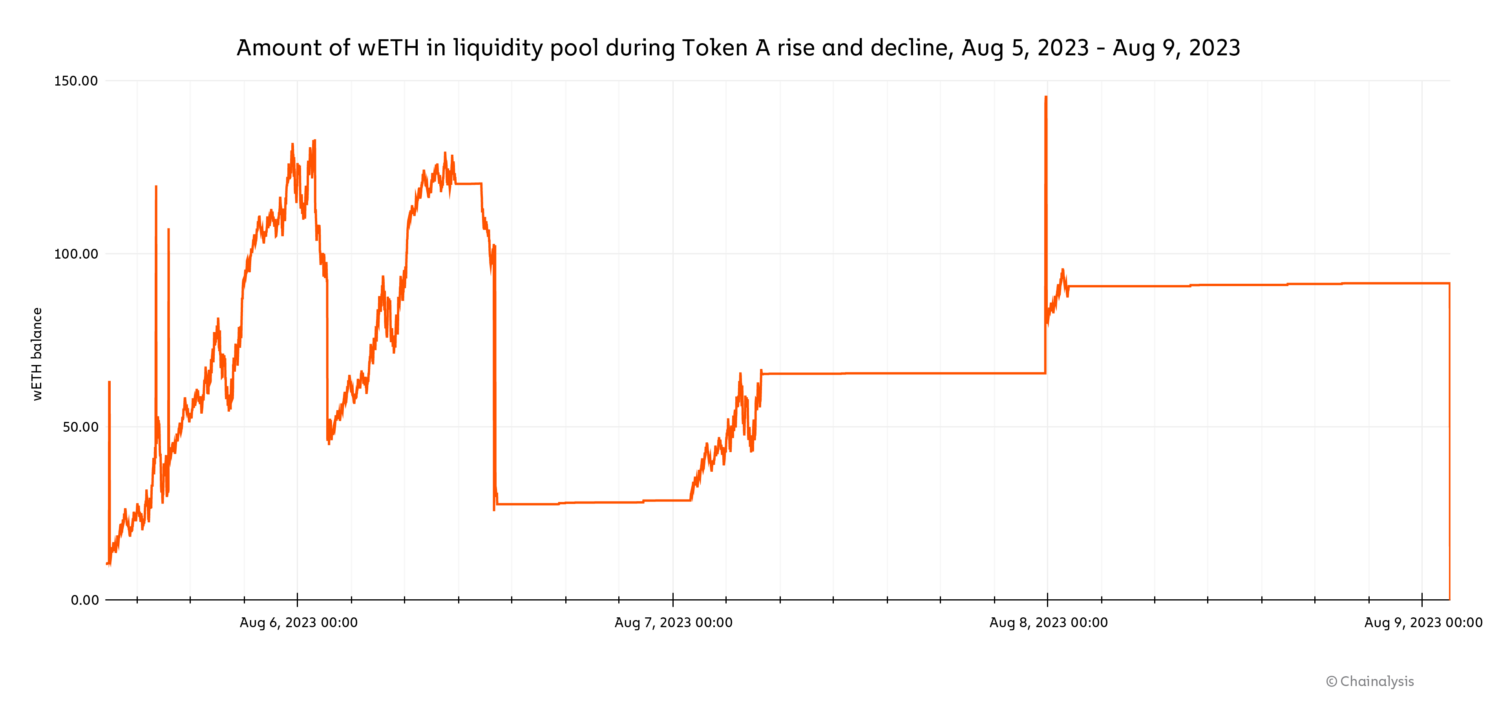 The below chart illustrates how the liquidity of the DEX pool shifted during this period, showing several sharp increases in the wETH balance on August 6. On the far right, we see that the liquidity moved back to zero once the address operator withdrew all funds on August 9. Overall, 108 other market participants using this DEX pool appear to have lost funds; they had purchased approximately $55,000 in Token A during this period.